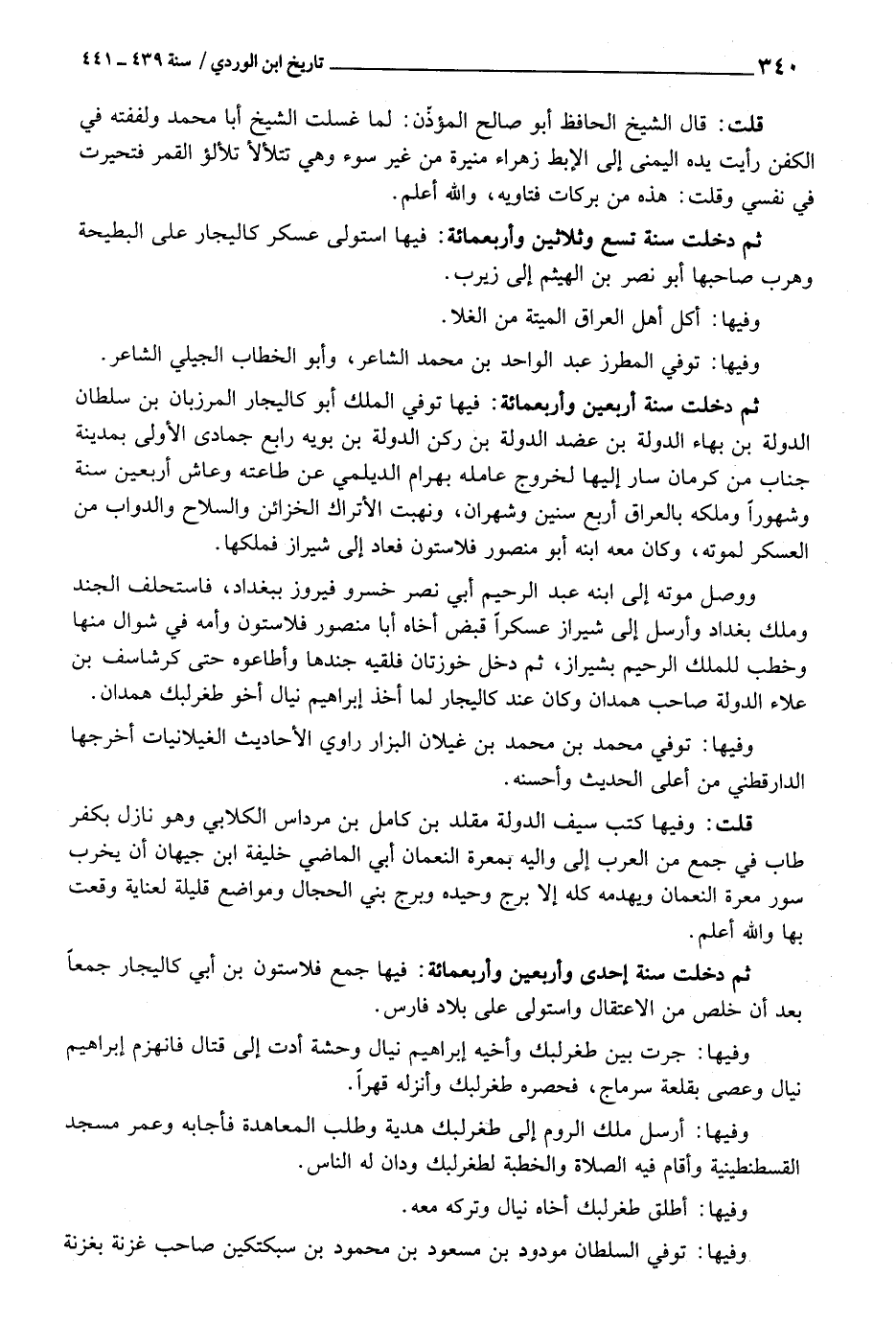 ثمَّ دخلت سنة أَرْبَعِينَ وَأَرْبَعمِائَة: فِيهَا توفّي الْملك أَبُو كاليجار الْمَرْزُبَان بن سُلْطَان الدولة بن بهاء الدولة بن عضد الدولة بن ركن الدولة بن بويه رَابِع جُمَادَى الأولى بِمَدِينَة جناب من كرمان سَار إِلَيْهَا لخُرُوج عَامله بهْرَام الديلمي عَن طَاعَته وعاش أَرْبَعِينَ سنة وشهورا وَملكه بالعراق أَربع سِنِين وشهران، ونهبت الأتراك الخزائن وَالسِّلَاح وَالدَّوَاب من الْعَسْكَر لمَوْته، وَكَانَ مَعَه ابْنه أَبُو مَنْصُور فلاستون فَعَاد إِلَى شيزار فملكها.