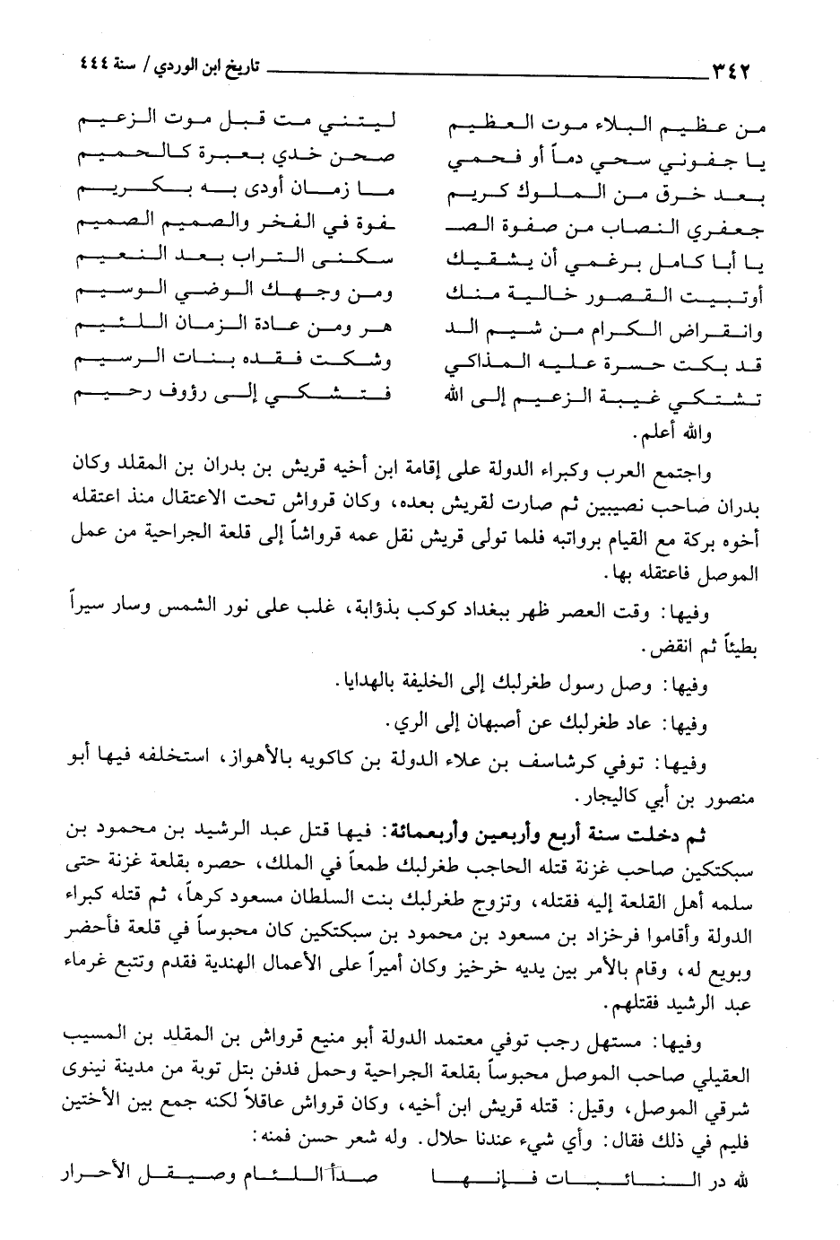 وفيهَا: مستهل رَجَب توفّي مُعْتَمد الدولة أَبُو منيع قرواش بن الْمُقَلّد بن الْمسيب الْعقيلِيّ صَاحب الْموصل مَحْبُوسًا بقلعة الجراحية وَحمل فَدفن بتل تَوْبَة من مَدِينَة نِينَوَى شَرْقي الْموصل، وَقيل: قَتله قُرَيْش ابْن أَخِيه، وَكَانَ قرواش عَاقِلا لكنه جمع بَين الْأُخْتَيْنِ فليم فِي ذَلِك فَقَالَ: وَأي شَيْء عندنَا حَلَال. وَله شعر حسن فَمِنْهُ: