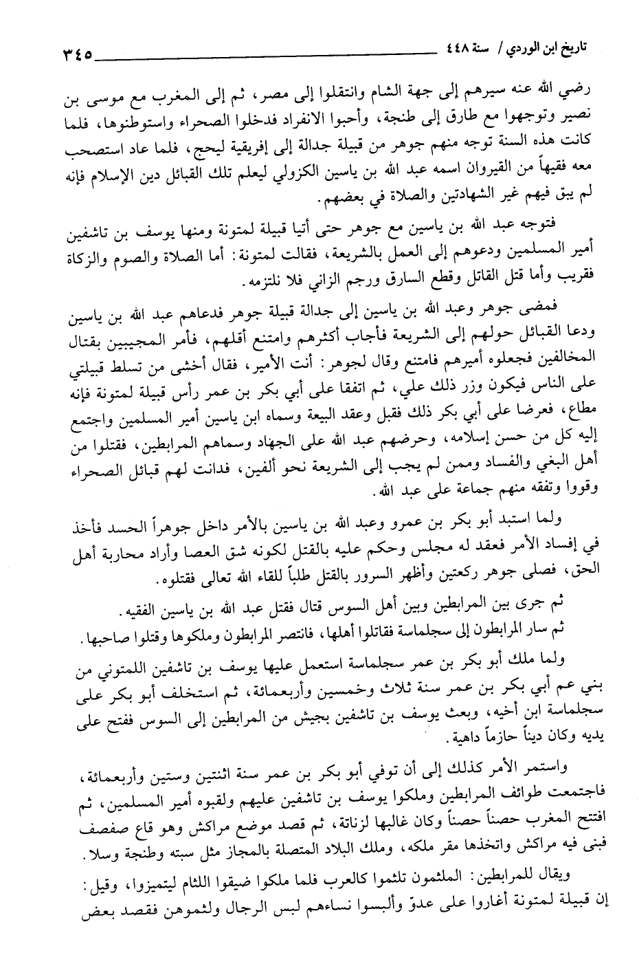 رَضِي اللَّهِ عَنهُ سيرهم إِلَى جِهَة الشَّام وانتقلوا إِلَى مصر، ثمَّ إِلَى الْمغرب مَعَ مُوسَى بن نصير وتوجهوا مَعَ طَارق إِلَى طنجة، وأحبوا الِانْفِرَاد فَدَخَلُوا الصَّحرَاء واستوطنوها، فَلَمَّا كَانَت هَذِه السّنة توجه مِنْهُم جَوْهَر من قَبيلَة جدالة إِلَى إفريقية ليحج، فَلَمَّا عَاد استصحب مَعَه فَقِيها من القيروان اسْمه عبد اللَّهِ بن ياسين الكزولي ليعلم تِلْكَ الْقَبَائِل دين الْإِسْلَام فَإِنَّهُ لم يبْق فيهم غير الشَّهَادَتَيْنِ وَالصَّلَاة فِي بَعضهم.