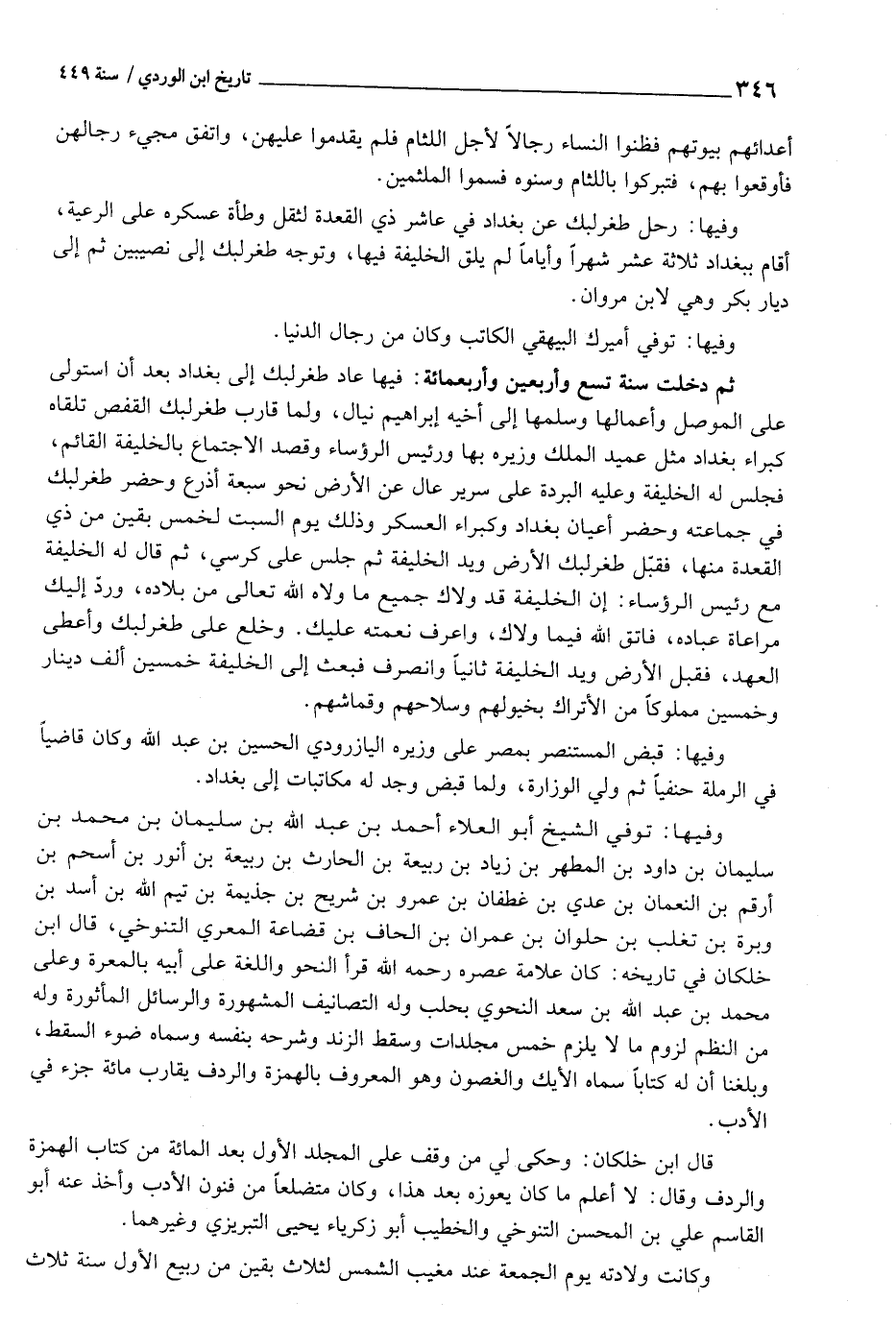 ثمَّ دخلت سنة تسع وَأَرْبَعين وَأَرْبَعمِائَة: فِيهَا عَاد طغرلبك إِلَى بَغْدَاد بعد أَن استولى على الْموصل وأعمالها وَسلمهَا إِلَى اخيه إِبْرَاهِيم نيال، وَلما قَارب طغرلبك القفص تَلقاهُ كبراء بَغْدَاد مثل عميد الْملك وزيره بهَا وَرَئِيس الرؤساء وَقصد الِاجْتِمَاع بالخليفة الْقَائِم، فَجَلَسَ لَهُ الْخَلِيفَة وَعَلِيهِ الْبردَة على سَرِير عَال من الأَرْض نَحْو سَبْعَة أَذْرع وَحضر طغرلبك فِي جماعته وَحضر أَعْيَان بَغْدَاد وكبراء الْعَسْكَر وَذَلِكَ يَوْم السبت لخمس بَقينَ من ذِي الْقعدَة مِنْهَا، فَقبل طغرلبك الأَرْض وَيَد الْخَلِيفَة ثمَّ جلس على كرْسِي، ثمَّ قَالَ لَهُ الْخَلِيفَة مَعَ رَئِيس الرؤساء: أَن الْخَلِيفَة قد ولاك جَمِيع مَا ولاه اللَّهِ تَعَالَى من بِلَاده، ورد إِلَيْك مُرَاعَاة عبَادَة، فَاتق اللَّهِ فِيمَا ولاك، واعرف نعْمَته عَلَيْك. وخلع على طغرلبك وَأعْطى الْعَهْد، فَقبل الأَرْض وَيَد الْخَلِيفَة ثَانِيًا وَانْصَرف فَبعث إِلَى الْخَلِيفَة خمسين ألف دِينَار وَخمسين مَمْلُوكا من الأتراك بخيولهم وسلاحهم وقماشهم.
