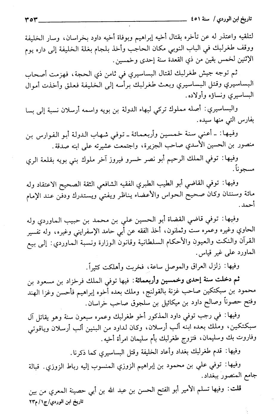 وفيهَا: قدم طغرلبك بَغْدَاد وَأعَاد الْخَلِيفَة وَقتل البساسيري كَمَا ذكرنَا.