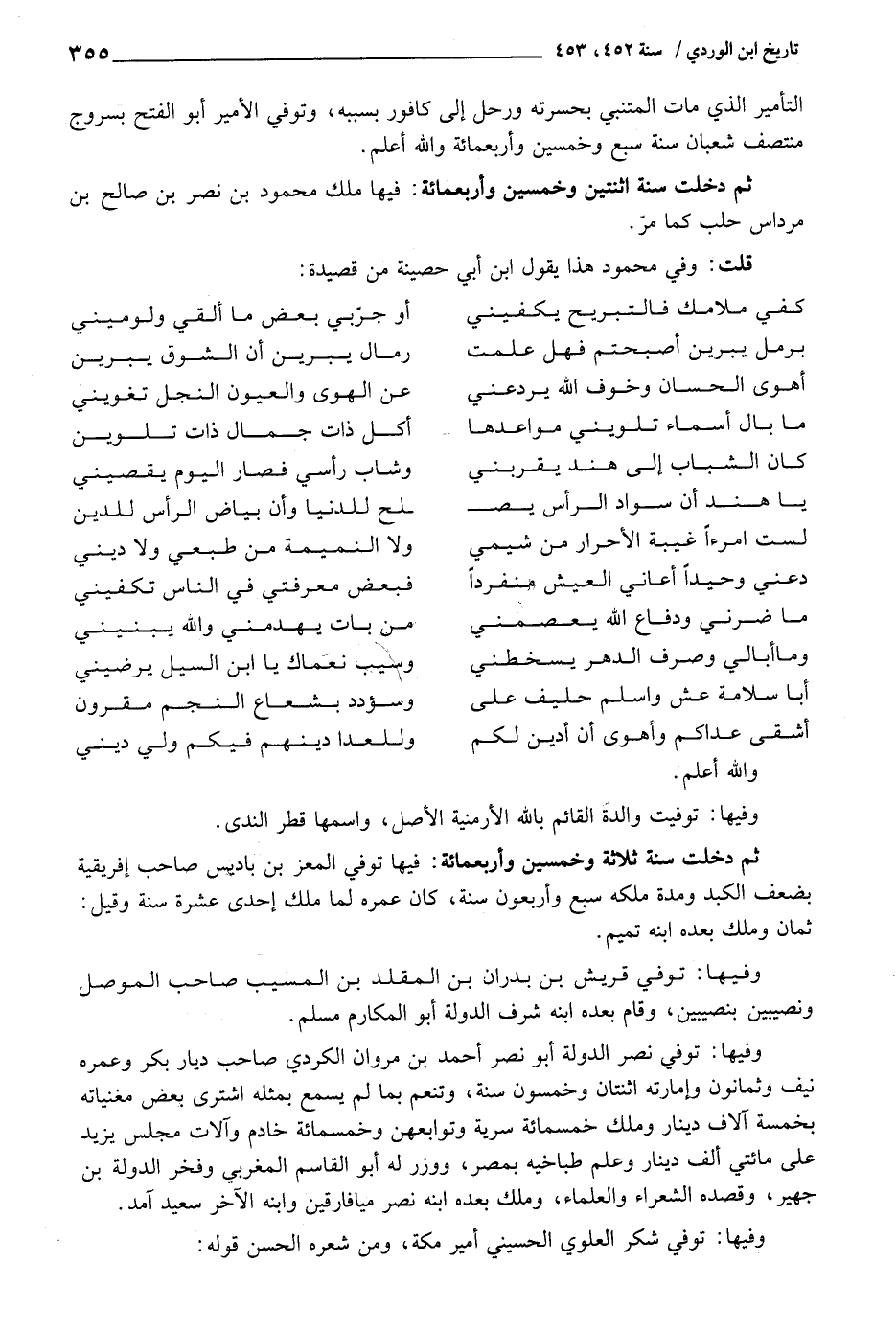 ثمَّ دخلت سنة اثْنَتَيْنِ وَخمسين وَأَرْبَعمِائَة: فِيهَا ملك مَحْمُود بن نصر بن صَالح بن مرداس حلب كَمَا مر.