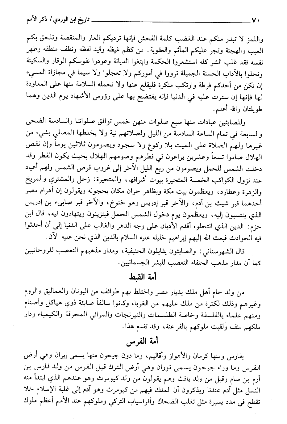 من ولد حام أهل ملك بديار مصر وَاخْتَلَطَ بهم طوائف من اليونان والعماليق وَالروم وَغَيرهم وَذَلِكَ لِكَثْرَة من ملك عَلَيْهِم من الغرباء وَكَانُوا سالفا صابئة ذَوي هياكل وأصنام وَمِنْهُم عُلَمَاء بالفلسفة وخاصة الطلسمات والنيرنجات والمرائي المحرقة والكيمياء وَدَار ملكهم منف ولقبت مُلُوكهمْ بالفراعنة، وَقد تقدم هَذَا.