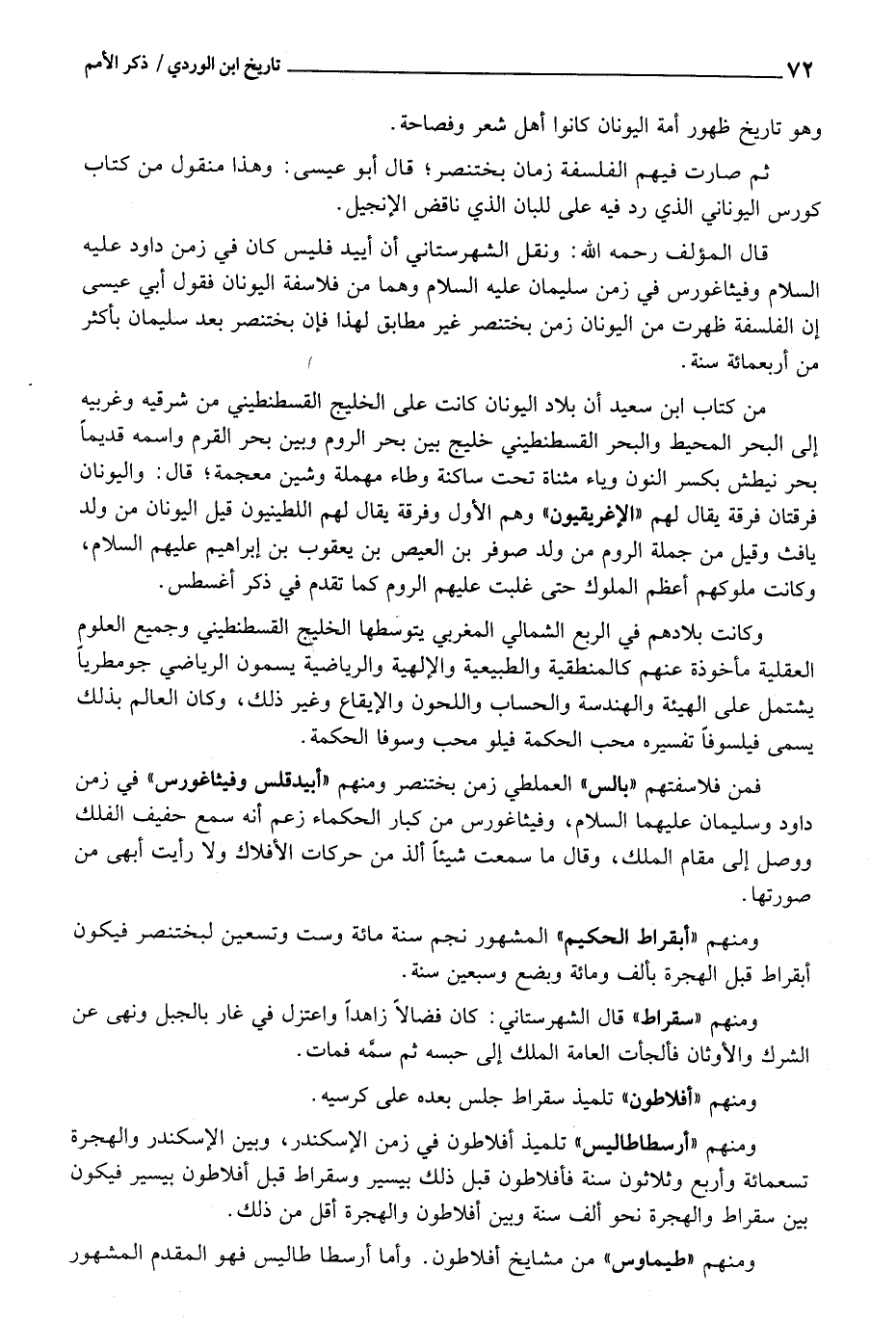 قَالَ الْمُؤلف رَحمَه اللَّهِ: وَنقل الشهرستاني أَن أييد فَلَيْسَ كَانَ فِي زمن دَاوُد عَلَيْهِ السَّلَام وفيثاغورس فِي زمن سُلَيْمَان عَلَيْهِ السَّلَام وهما من فلاسفة اليونان فَقَوْل أبي عِيسَى إِن الفلسفة ظَهرت من اليونان زمن بخْتنصر غير مُطَابق لهَذَا فَإِن بخْتنصر بعد سُلَيْمَان بِأَكْثَرَ من أَرْبَعمِائَة سنة.