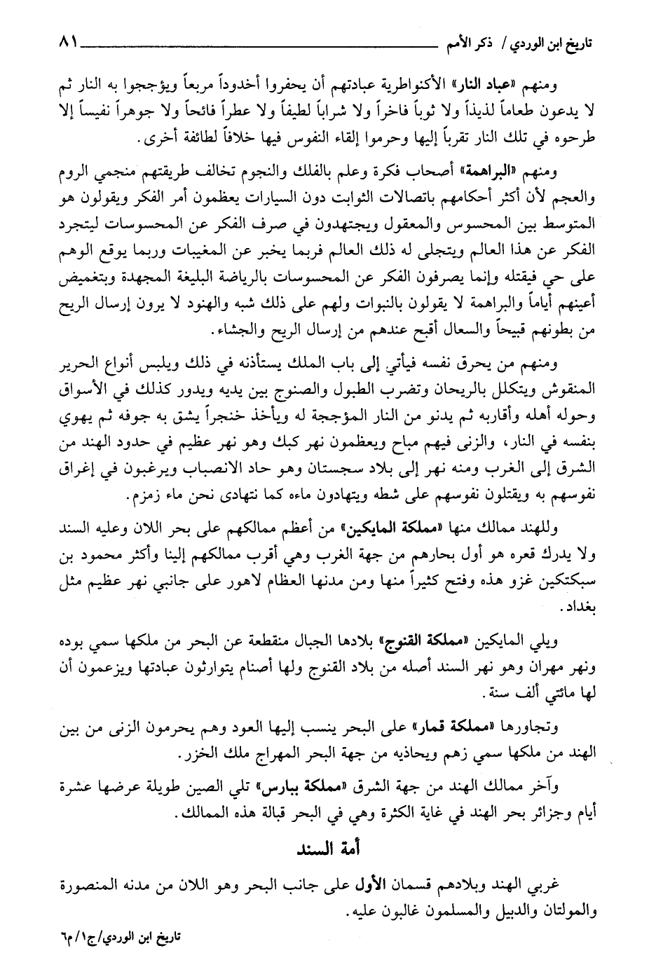 وللهند ممالك مِنْهَا " مملكة المايكين " من أعظم ممالكهم على بَحر اللان وَعَلِيهِ السَّنَد وَلَا يدْرك قَعْره هُوَ أول بحارهم من جِهَة الغرب وَهِي أقرب ممالكهم إِلَيْنَا وَأكْثر مَحْمُود بن سبكتكين غَزْو هَذِه وَفتح كثيرا مِنْهَا وَمن مدنها الْعِظَام لاهور على جَانِبي نهر عَظِيم مثل بَغْدَاد.