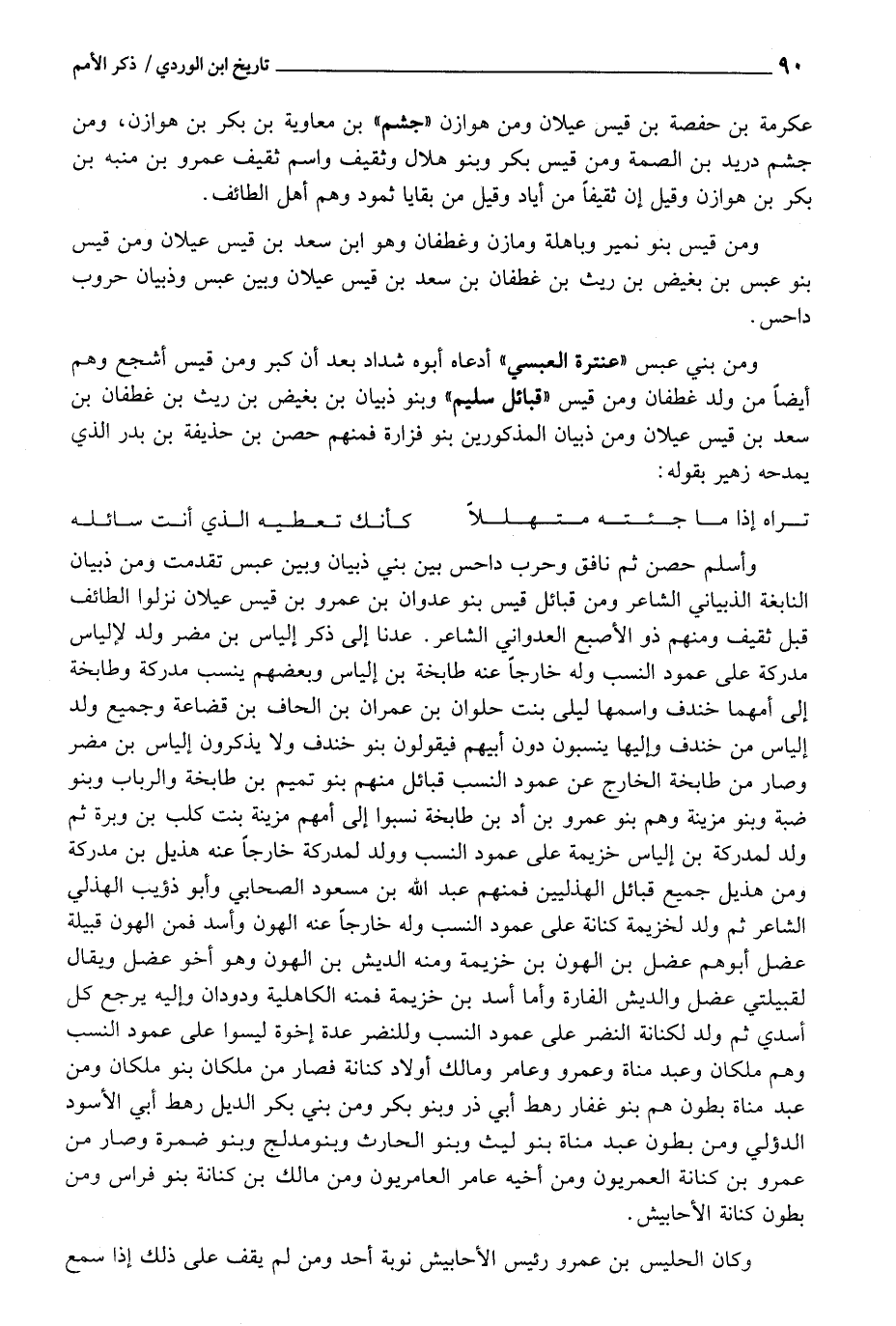 وَأسلم حصن ثمَّ نَافق وَحرب داحس بَين بني ذبيان وَبَين عبس تقدّمت وَمن ذبيان النَّابِغَة الذبياني الشَّاعِر وَمن قبائل قيس بَنو عدوان بن عَمْرو بن قيس عيلان نزلُوا الطَّائِف قبل ثَقِيف وَمِنْهُم ذُو الْأصْبع العدواني الشَّاعِر. عدنا إِلَى ذكر إلْيَاس بن مُضر ولد لإلياس مدركة على عَمُود النّسَب وَله خَارِجا عَنهُ طابخة بن إلْيَاس وَبَعْضهمْ ينْسب مدركة وطابخة إِلَى أمهما خندف وَاسْمهَا ليلى بنت حلوان بن عمرَان بن الحاف بن قضاعة وَجَمِيع ولد إلْيَاس من خندف وإليها ينسبون دون أَبِيهِم فَيَقُولُونَ بَنو خندف وَلَا يذكرُونَ إلْيَاس بن مُضر وَصَارَ من طابخة الْخَارِج عَن عَمُود النّسَب قبائل مِنْهُم بَنو تَمِيم بن طابخة والرباب وَبَنُو ضبة وَبَنُو مزينة وهم بَنو عَمْرو بن أد بن طابخة نسبوا إِلَى أمّهم مزينة بنت كلب بن وبرة ثمَّ ولد لمدركة بن إلْيَاس خُزَيْمَة على عَمُود النّسَب وَولد لمدركة خَارِجا عَنهُ هُذَيْل بن مدركة وَمن هُذَيْل جَمِيع قبائل الهذليين فَمنهمْ عبد اللَّهِ بن مَسْعُود الصَّحَابِيّ وَأَبُو ذُؤَيْب الْهُذلِيّ الشَّاعِر ثمَّ ولد لخزيمة كنَانَة على عَمُود النّسَب وَله خَارِجا عَنهُ الْهون وَأسد فَمن الْهون قَبيلَة عضل أبوهم عضل بن الْهون بن خُزَيْمَة وَمِنْه الديش بن الْهون وَهُوَ أَخُو عضل وَيُقَال لقبيلتي عضل والديش الفارة وَأما اسد بن خُزَيْمَة فَمِنْهُ الكاهلية ودودان وَإِلَيْهِ يرجع كل أسدي ثمَّ ولد لكنانة النَّضر على عَمُود النّسَب وللنضر عدَّة إخْوَة لَيْسُوا على عَمُود النّسَب وهم ملكان وَعبد مَنَاة وَعَمْرو وعامر وَمَالك أَوْلَاد كنَانَة فَصَارَ من ملكان بَنو ملكان وَمن عبد مَنَاة بطُون هم بَنو غفار رَهْط أبي ذَر وَبَنُو بكر وَمن بني بكر الديل رَهْط أبي الْأسود الدؤَلِي وَمن بطُون عبد مَنَاة بَنو لَيْث وَبَنُو الْحَارِث وبنومدلج وَبَنُو ضَمرَة وَصَارَ من عَمْرو بن كنَانَة العمريون وَمن أَخِيه عَامر العامريون وَمن مَالك بن كنَانَة بَنو فراس وَمن بطُون كنَانَة الْأَحَابِيش.
