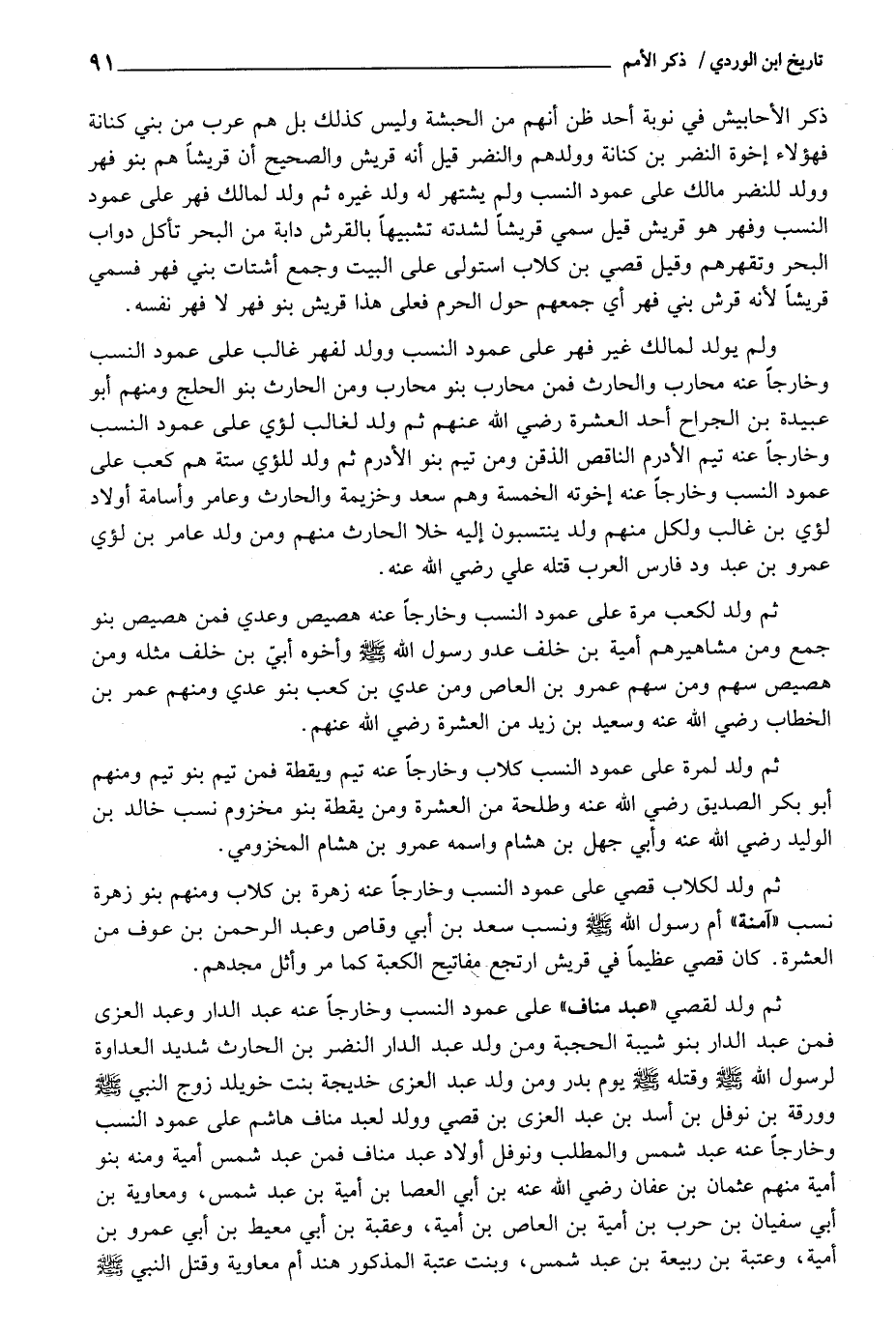 ثمَّ ولد لقصي " عبد منَاف " على عَمُود النّسَب وخارجا عَنهُ عبد الدَّار وَعبد الْعُزَّى فَمن عبد الدَّار بَنو شيبَة الحجبة وَمن ولد عبد الدَّار النَّضر بن الْحَارِث شَدِيد الْعَدَاوَة لرَسُول اللَّهِ - صَلَّى اللَّهُ عَلَيْهِ وَسَلَّم َ - وَقَتله - صَلَّى اللَّهُ عَلَيْهِ وَسَلَّم َ - يَوْم بدر وَمن ولد عبد الْعُزَّى خَدِيجَة بنت خويلد زوج النَّبِي - صَلَّى اللَّهُ عَلَيْهِ وَسَلَّم َ - وورقة بن نَوْفَل بن أَسد بن عبد الْعُزَّى بن قصي وَولد لعبد منَاف هَاشم على عَمُود النّسَب وخارجا عَنهُ عبد شمس وَالْمطلب وَنَوْفَل أَوْلَاد عبد منَاف فَمن عبد شمس أُميَّة وَمِنْه بَنو أُميَّة مِنْهُم عُثْمَان بن عَفَّان رَضِي اللَّهِ عَنهُ بن أبي الْعَصَا بن أُميَّة بن عبد شمس، وَمُعَاوِيَة بن أبي سُفْيَان بن حَرْب بن أُميَّة بن الْعَاصِ بن أُميَّة، وَعقبَة بن أبي معيط بن أبي عَمْرو بن أُميَّة، وَعتبَة بن ربيعَة بن عبد شمس، وَبنت عتبَة الْمَذْكُور هِنْد أم مُعَاوِيَة وَقتل النَّبِي - صَلَّى اللَّهُ عَلَيْهِ وَسَلَّم َ -