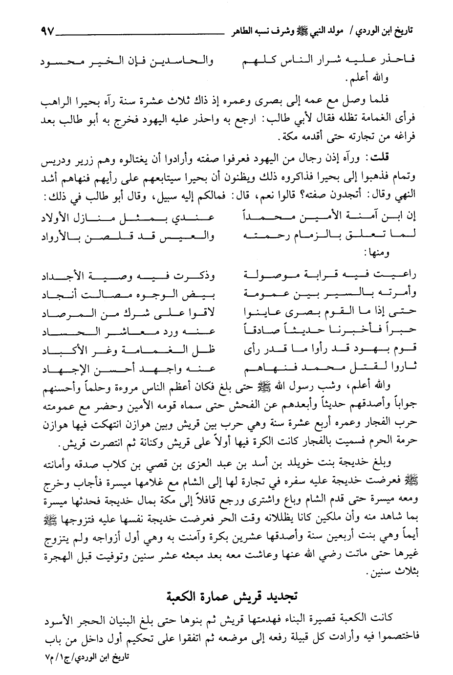 وَبلغ خَدِيجَة بنت خويلد بن أَسد بن عبد الْعُزَّى بن قصي بن كلاب صدقه وأمانته - صَلَّى اللَّهُ عَلَيْهِ وَسَلَّم َ - فعرضت خَدِيجَة عَلَيْهِ سَفَره فِي تِجَارَة لَهَا إِلَى الشَّام مَعَ غلامها ميسرَة فَأجَاب وَخرج وَمَعَهُ ميسرَة حَتَّى قدم الشَّام وَبَاعَ وَاشْترى وَرجع قَافِلًا إِلَى مَكَّة بِمَال خَدِيجَة فحدثها ميسرَة بِمَا شَاهد مِنْهُ وَأَن ملكَيْنِ كَانَا يظلانه وَقت الْحر فعرضت خَدِيجَة نَفسهَا عَلَيْهِ فَتَزَوجهَا - صَلَّى اللَّهُ عَلَيْهِ وَسَلَّم َ - أَيّمَا وَهِي بنت أَرْبَعِينَ سنة وَأصْدقهَا عشْرين بكرَة وَآمَنت بِهِ وَهِي أول أَزوَاجه وَلم يتَزَوَّج غَيرهَا حَتَّى مَاتَ رَضِي اللَّهِ عَنْهَا وَعَاشَتْ مَعَه بعد مبعثه عشر سِنِين وَتوفيت قبل الْهِجْرَة بِثَلَاث سِنِين.