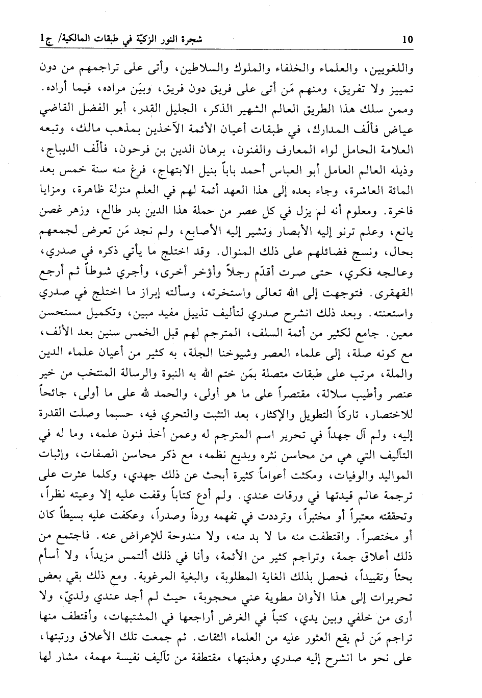 واللغويين، والعلماء والخلفاء والملوك والسلاطين، وأتى على تراجمهم من دون تمييز ولا تفريق، ومنهم مَن أتى على فريق دون فريق، وبيّن مراده، فيما أراده. وممن سلك هذا الطريق العالم الشهير الذكر، الجليل القدر، أبو الفضل القاضي عياض فألّف المدارك، في طبقات أعيان الأئمة الآخذين بمذهب مالك، وتبعه العلامة الحامل لواء المعارف والفنون، برهان الدين بن فرحون، فألّف الديباج، وذيله العالم العامل أبو العباس أحمد باباً بنيل الابتهاج، فرغ منه سنة خمس بعد المائة العاشرة، وجاء بعده إلى هذا العهد أئمة لهم في العلم منزلة ظاهرة، ومزايا فاخرة. ومعلوم أنه لم يزل في كل عصر من حملة هذا الدين بدر طالع، وزهر غصن يانع، وعلم ترنو إليه الأبصار وتشير إليه الأصابع، ولم نجد مَن تعرض لجمعهم بحال، ونسج فضائلهم على ذلك المنوال. وقد اختلج ما يأتي ذكره في صدري، وعالجه فكري، حتى صرت أقدّم رجلاً وأؤخر أخرى، وأجري شوطاً ثم أرجع القهقرى. فتوجهت إلى الله تعالى واستخرته، وسألته إبراز ما اختلج في صدري واستعنته. وبعد ذلك انشرح صدري لتأليف تذييل مفيد مبين، وتكميل مستحسن معين. جامع لكثير من أئمة السلف، المترجم لهم قبل الخمس سنين بعد الألف، مع كونه صلة، إلى علماء العصر وشيوخنا الجلة، به كثير من أعيان علماء الدين والملة، مرتب على طبقات متصلة بمَن ختم الله به النبوة والرسالة المنتخب من خير عنصر وأطيب سلالة، مقتصراً على ما هو أولى، والحمد لله على ما أولى، جائحاً للاختصار، تاركاً التطويل والإكثار، بعد التثبت والتحري فيه، حسبما وصلت القدرة إليه، ولم آل جهداً في تحرير اسم المترجم له وعمن أخذ فنون علمه، وما له في التآليف التي هي من محاسن نثره وبديع نظمه، مع ذكر محاسن الصفات، وإثبات المواليد والوفيات، ومكثت أعواماً كثيرة أبحث عن ذلك جهدي، وكلما عثرت على ترجمة عالم قيدتها في ورقات عندي. ولم أدع كتاباً وقفت عليه إلا وعيته نظراً، وتحققته معتبراً أو مختبراً، وترددت في تفهمه ورداً وصدراً، وعكفت عليه بسيطاً كان أو مختصراً. واقتطفت منه ما لا بد منه، ولا مندوحة للإعراض عنه. فاجتمع من ذلك أعلاق جمة، وتراجم كثير من الأئمة، وأنا في ذلك ألتمس مزيداً، ولا أسأم بحثاً وتقييداً، فحصل بذلك الغاية المطلوبة، والبغية المرغوبة. ومع ذلك بقي بعض تحريرات إلى هذا الأوان مطوية عني محجوبة، حيث لم أجد عندي ولديّ، ولا أرى من خلفي وبين يدي، كتباً في الغرض أراجعها في المشتبهات، وأقتطف منها تراجم مَن لم يقع العثور عليه من العلماء الثقات. ثم جمعت تلك الأعلاق ورتبتها، على نحو ما انشرح إليه صدري وهذبتها، مقتطفة من تآليف نفيسة مهمة، مشار لها