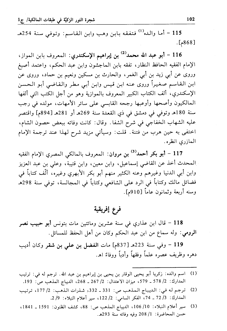 116 - أبو عبد الله محمَّد بن إبراهيم الإسكندري: المعروف بابن المواز، الإمام الفقيه الحافظ النظار، تفقه بابن الماجشون وابن عبد الحكم، واعتمد أصبغ وروى عن أبي زيد بن أبي الغمر، والحارث بن مسكين ونعيم بن حماد، وروى عن ابن القاسم صغيراً وروى عنه ابن قيس وابن أبي مطر والقاضي أبو الحسن الإسكندري، ألف الكتاب الكبير المعروف بالموازية وهو من أجل الكتب التي ألفها المالكيون وأصحها وأوعبها رجحه القابسي على سائر الأمهات، مولده في رجب سنة 180 هـ وتوفي في دمشق في ذي القعدة سنة 269 هـ أو 281 هـ[894 م] واقتصر عليه الشهاب الخفاجي في شرح الشفا. وقال: كانت وفاته ببعض حصون الشام، اختفى به حين هرب من فتنة. قلت: وسيأتي مزيد شرح لهذا عند ترجمة الإمام المازري انظره.