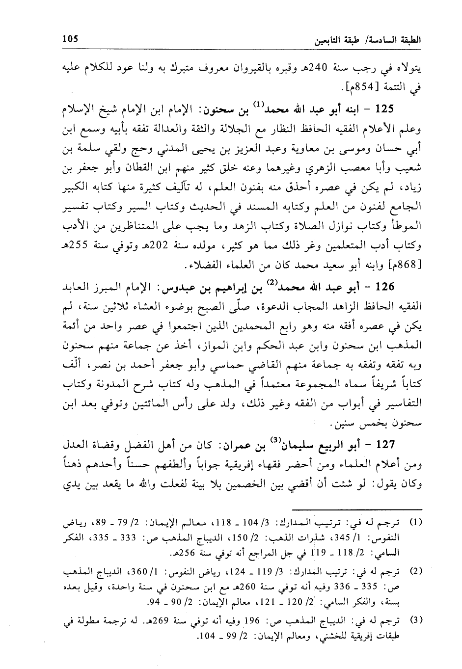 125 - ابنه أبو عبد الله محمَّد بن سحنون: الإِمام ابن الإمام شيخ الإسلام وعلم الأعلام الفقيه الحافظ النظار مع الجلالة والثقة والعدالة تفقه بأبيه وسمع ابن أبي حسان وموسى بن معاوية وعبد العزيز بن يحيى المدني وحج ولقي سلمة بن شعيب وأبا معصب الزهري وغيرهما وعنه خلق كثير منهم ابن القطان وأبو جعفر بن زياد، لم يكن في عصره أحذق منه بفنون العلم، له تآليف كثيرة منها كتابه الكبير الجامع لفنون من العلم وكتابه المسند في الحديث وكتاب السير وكتاب تفسير الموطأ وكتاب نوازل الصلاة وكتاب الزهد وما يجب على المتناظرين من الأدب وكتاب أدب المتعلمين وغر ذلك مما هو كثير، مولده سنة 202 هـ وتوفي سنة 255 هـ[868 م] وابنه أبو سعيد محمَّد كان من العلماء الفضلاء.