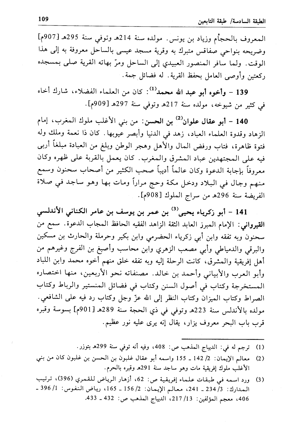 141 - أبو زكرياء يحيى بن عمر بن يوسف بن عامر الكناني الأندلسي القيرواني: الإمام المبرز العابد الثقة الزاهد الفقيه الحافظ المجاب الدعوة. سمع من سحنون وبه تفقه وابن أبي زكرياء الحضرمي وابن بكير وحرملة والحارث بن مسكين والبرقي والدمياطي وأبي مصعب الزهري وابن محاسب وأصبغ بن الفرج وغيرهم من أهل إفريقية والمشرق، كانت الرحلة إليه وبه تفقه خلق منهم أخوه محمد وابن اللباد وأبو العرب والأبياني وأحمد بن خالد. مصنفاته نحو الأربعين، منها اختصاره المستخرجة وكتاب في أصول السنن وكتاب في فضائل المنستير والرباط وكتاب الصراط وكتاب الميزان وكتاب النظر إلى الله عزّ وجل وكتاب رد فيه على الشافعي. مولده بالأندلس سنة 223 هـ وتوفي في ذي الحجة سنة 289 هـ[901 م] بسوسة وقبره قرب باب البحر معروف يزار، يقال إنه يرى عليه نور عظيم.