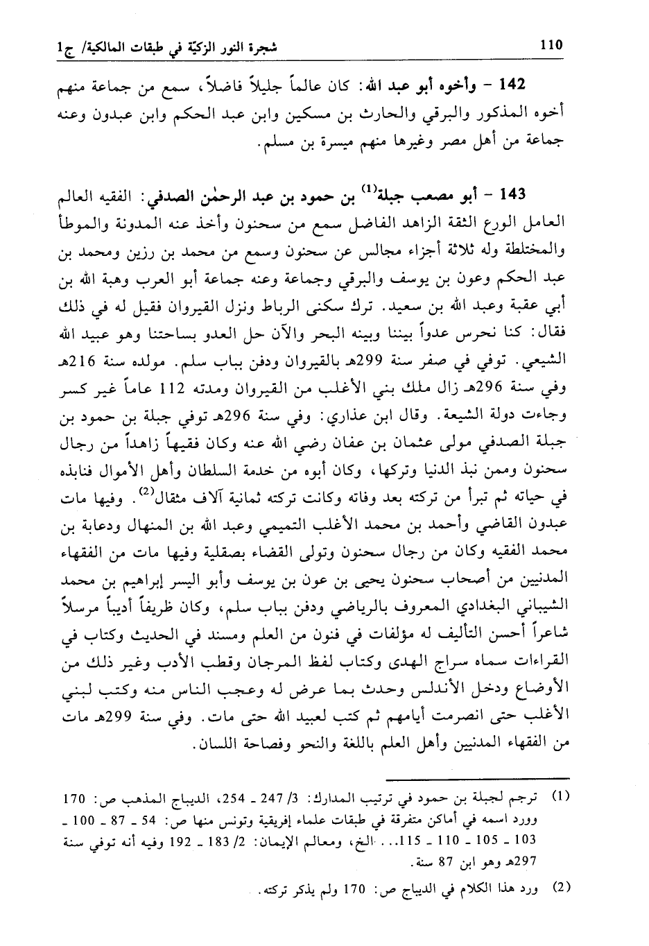 143 - أبو مصعب جبلة بن حمود بن عبد الرحمن الصدفي: الفقيه العالم العامل الورع الثقة الزاهد الفاضل سمع من سحنون وأخذ عنه المدونة والموطأ والمختلطة وله ثلاثة أجزاء مجالس عن سحنون وسمع من محمَّد بن رزين ومحمد بن عبد الحكم وعون بن يوسف والبرقي وجماعة وعنه جماعة أبو العرب وهبة الله بن أبي عقبة وعبد الله بن سعيد. ترك سكنى الرباط ونزل القيروان فقيل له في ذلك فقال: كنا نحرس عدواً بيننا وبينه البحر والآن حل العدو بساحتنا وهو عبيد الله الشيعي. توفي في صفر سنة 299 هـ بالقيروان ودفن بباب سلم. مولده سنة 216 هـ وفي سنة 296 هـ زال ملك بني الأغلب من القيروان ومدته 112 عاماً غير كسر وجاءت دولة الشيعة. وقال ابن عذاري: وفي سنة 296 هـ توفي جبلة بن حمود بن جبلة الصدفي مولى عثمان بن عفان رضي الله عنه وكان فقيهاً زاهداً من رجال سحنون وممن نبذ الدنيا وتركها، وكان أبوه من خدمة السلطان وأهل الأموال فنابذه في حياته ثم تبرأ من تركته بعد وفاته وكانت تركته ثمانية آلاف مثقال. وفيها مات عبدون القاضي وأحمد بن محمَّد الأغلب التميمي وعبد الله بن المنهال ودعابة بن محمَّد الفقيه وكان من رجال سحنون وتولى القضاء بصقلية وفيها مات من الفقهاء المدنيين من أصحاب سحنون يحيى بن عون بن يوسف وأبو اليسر إبراهيم بن محمَّد الشيباني البغدادي المعروف بالرياضي ودفن بباب سلم، وكان ظريفاً أديباً مرسلاً شاعراً أحسن التأليف له مؤلفات في فنون من العلم ومسند في الحديث وكتاب في القراءات سماه سراج الهدى وكتاب لفظ المرجان وقطب الأدب وغير ذلك من الأوضاع ودخل الأندلس وحدث بما عرض له وعجب الناس منه وكتب لبني الأغلب حتى انصرمت أيامهم ثم كتب لعبيد الله حتى مات. وفي سنة 299 هـ مات من الفقهاء المدنيين وأهل العلم باللغة والنحو وفصاحة اللسان.