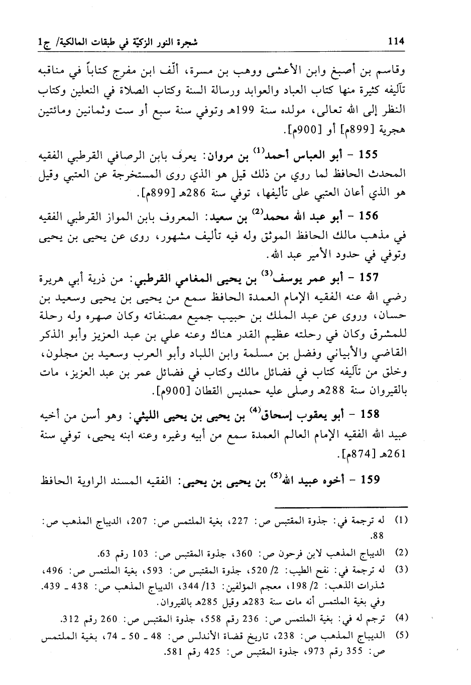 156 - أبو عبد الله محمَّد بن سعيد: المعروف بابن المواز القرطبي الفقيه في مذهب مالك الحافظ الموثق وله فيه تأليف مشهور، روى عن يحيى بن يحيى وتوفي في حدود الأمير عبد الله.
