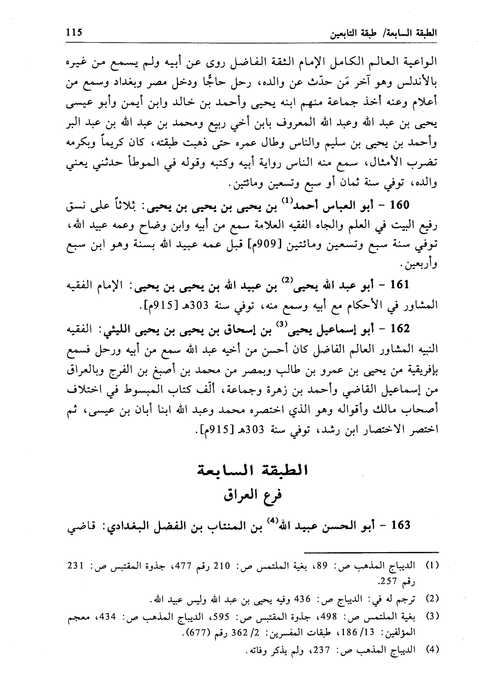 162 - أبو إسماعيل يحيى بن إسحاق بن يحيى بن يحيى الليثي: الفقيه النبيه المشاور العالم الفاضل كان أحسن من أخيه عبد الله سمع من أبيه ورحل فسمع بإفريقية من يحيى بن عمرو بن طالب وبمصر من محمَّد بن أصبغ بن الفرج وبالعراق من إسماعيل القاضي وأحمد بن زهرة وجماعة، ألّف كتاب المبسوط في اختلاف أصحاب مالك وأقواله وهو الذي اختصره محمَّد وعبد الله ابنا أبان بن عيسى، ثم اختصر الاختصار ابن رشد، توفي سنة 303 هـ[915 م].