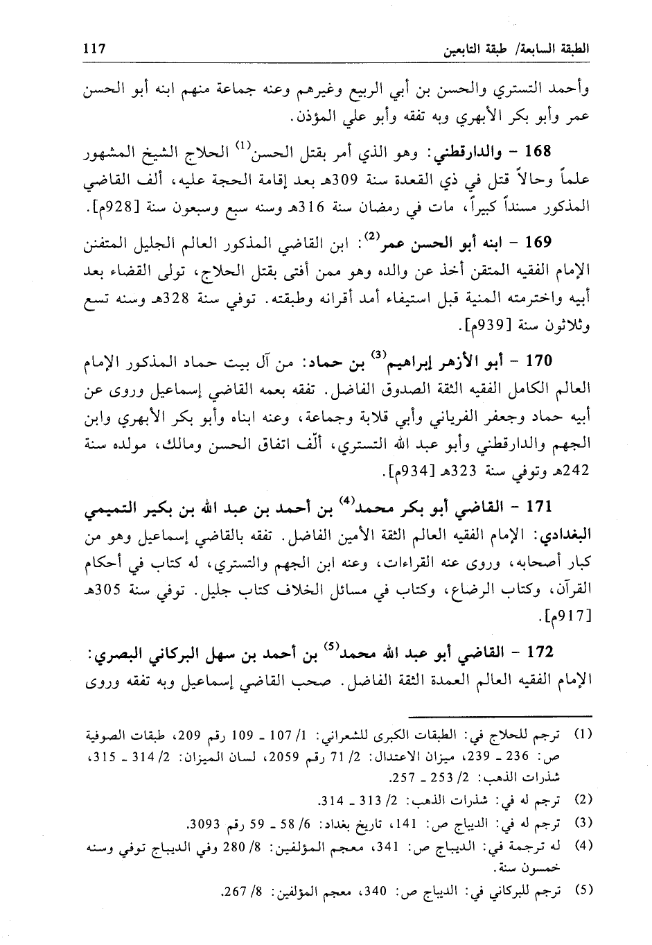 168 - والدارقطني: وهو الذي أمر بقتل الحسن الحلاج الشيخ المشهور علماً وحالاً قتل في ذي القعدة سنة 309 هـ بعد إقامة الحجة عليه، ألف القاضي المذكور مسنداً كبيراً، مات في رمضان سنة 316 ص وسنه سبع وسبعون سنة [928 م].