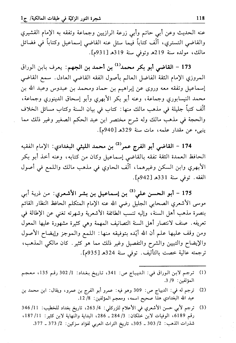 173 - القاضي أبو بكر محمد بن أحمد بن الجهم: يعرف بابن الوراق المروزي الإمام الثقة الفاضل العالم بأصول الفقه القاضي العادل. سمع القاضي إسماعيل وتفقه معه وروى عن إبراهيم بن حماد ومحمد بن عبدوس وعبد الله بن محمد النيسابوري وجماعة، وعنه أبو بكر الأبهري وأبو إسحاق الدينوري وجماعة، ألّف كتباً جليلة في مذهب مالك منها: كتاب في بيان السنة وكتاب مسائل الخلاف والحجة في مذهب مالك وله شرح مختصر ابن عبد الحكم الصغير وغير ذلك مما ينبىء عن مقدار علمه، مات سنة 329هـ[940 م].