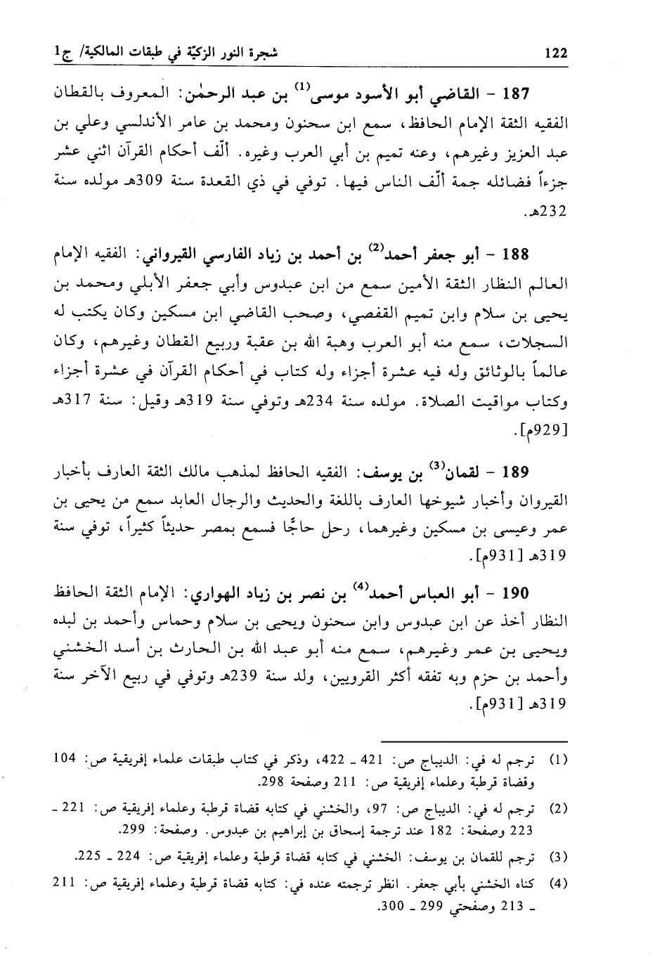 187 - القاضي أبو الأسود موسى بن عبد الرحمن: المعروف بالقطان الفقيه الثقة الإمام الحافظ، سمع ابن سحنون ومحمد بن عامر الأندلسي وعلي بن عبد العزيز وغيرهم، وعنه تميم بن أبي العرب وغيره. ألّف أحكام القرآن اثني عشر جزءًا فضائله جمة ألّف الناس فيها. توفي في ذي القعدة سنة 309 هـ مولده سنة 232هـ.