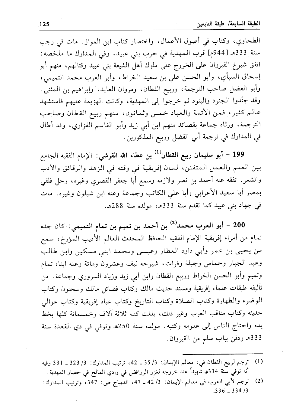 199 - أبو سليمان رببع القطان بن عطاء الله القرشي: الإمام الفقيه الجامع بين العلم والعمل المتفنن، لسان إفريقية في وقته في الزهد والرقائق والأدب والشعر. تفقه عنه أحمد بن نصر ولازمه وسمع أبا جعفر القصري وغيره، رحل فلقي بمصر أبا سعيد الأعرابي وأبا علي الكاتب وجماعة وعنه ابن شبلون وغيره. مات في جهاد بني عبيد كما تقدم سنة 333هـ، مولده سنة 288 هـ.