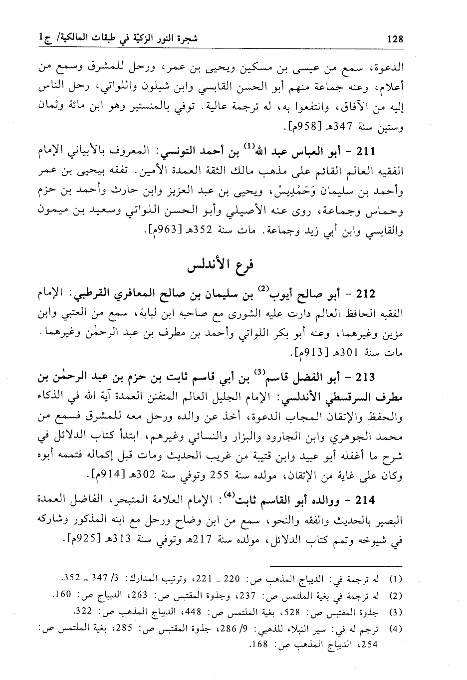 211 - أبو العباس عبد الله بن أحمد التونسي: المعروف بالأبياني الإمام الفقيه العالم القائم على مذهب مالك الثقة العمدة الأمين. تفقه بيحيى بن عمر وأحمد بن سليمان وَحَمْدِيسْ، ويحيى بن عبد العزيز وابن حارث وأحمد بن حزم وحماس وجماعة، روى عنه الأصيلي وأبو الحسن اللواتي وسعيد بن ميمون والقابسي وابن أبي زيد وجماعة. مات سنة 352 هـ[963 م].