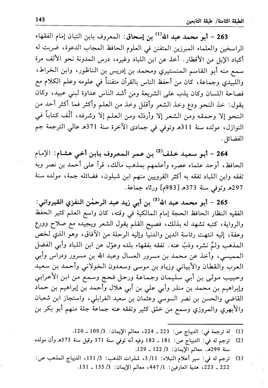 265 - أبو محمَّد عبد الله بن أبي زيد عبد الرحمن النفزي القيرواني: الفقيه النظار الحافظ الحجة إمام المالكية في وقته، كان واسع العلم كثير الحفظ والرواية، كتبه تشهد له بذلك، فصيح القلم يقول الشعر ويجيده مع صلاح وورع وعفة، إليه انتهت رئاسة الدين والدنيا وإليه الرحلة من الآفاق، وهو الذي لخص المذهب ولمَّ نشره وذبّ عنه. تفقه بفقهاء بلده وعوّل عن ابن اللباد وأبي الفضل المميسي، وأخذ عن محمَّد بن مسرور العسال وعبد الله بن مسرور ودراس وأبي العرب والقطان والأبياني وزياد بن موسى وسعدون الخولاني وأحمد بن سعيد وحبيب مولى بن أبي سليمان وجماعة ورحل فحج وسمع من ابن الأعرابي وإبراهيم بن محمَّد بن منذر وأبي علي بن أبي هلال وأحمد بن إبراهيم بن حماد القاضي والحسن بن نصر السوسي وعثمان بن سعيد الغرابلي، واستجاز ابن شعبان والأبهري والمروزي وسمع من خلق كثير وتفقه عنه جماعة جلة منهم أبو بكر بن