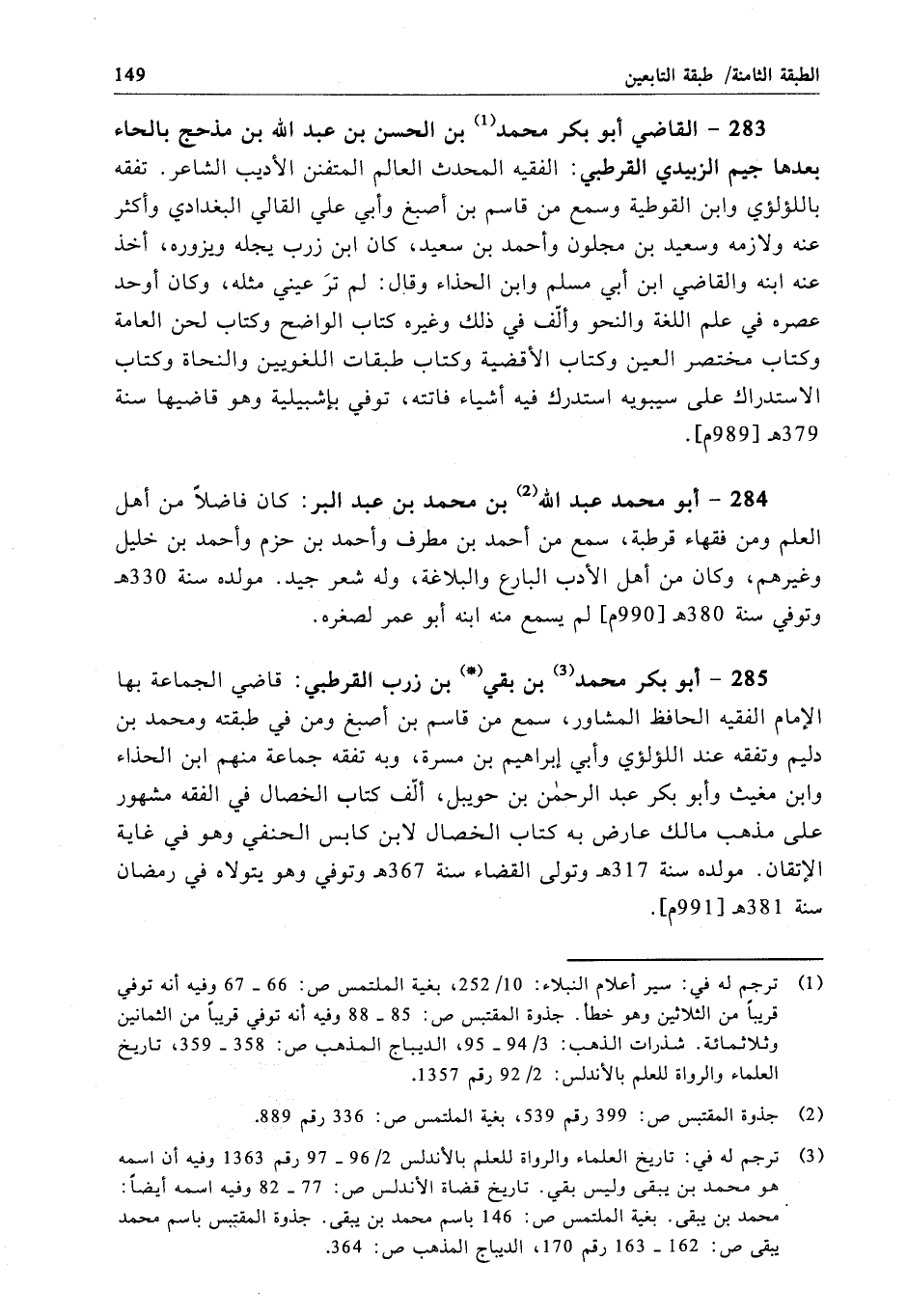 283 - القاضي أبو بكر محمَّد بن الحسن بن عبد الله بن مذحج بالحاء بعدها جيم الزبيدي القرطبي: الفقيه المحدث العالم المتفنن الأديب الشاعر. تفقه باللؤلؤي وابن القوطية وسمع من قاسم بن أصبغ وأبي علي القالي البغدادي وأكثر عنه ولازمه وسعيد بن مجلون وأحمد بن سعيد، كان ابن زرب يجله ويزوره، أخذ عنه ابنه والقاضي ابن أبي مسلم وابن الحذاء وقال: لم ترَ عيني مثله، وكان أوحد عصره في علم اللغة والنحو وألّف في ذلك وغيره كتاب الواضح وكتاب لحن العامة وكتاب مختصر العين وكتاب الأقضية وكتاب طبقات اللغويين والنحاة وكتاب الاستدراك على سيبويه استدرك فيه أشياء فاتته، توفي بإشبيلية وهو قاضيها سنة 379 هـ[989 م].