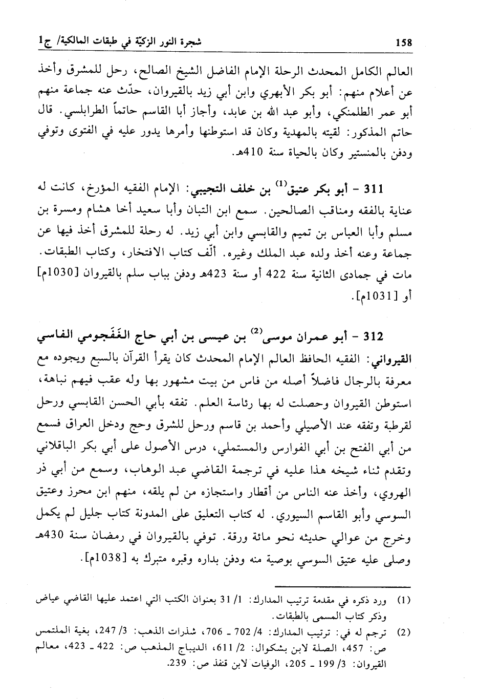 311 - أبو بكر عتيق بن خلف التجيبي: الإِمام الفقيه المؤرخ، كانت له عناية بالفقه ومناقب الصالحين. سمع ابن التبان وأبا سعيد أخا هشام ومسرة بن مسلم وأبا العباس بن تميم والقابسي وابن أبي زيد. له رحلة للمشرق أخذ فيها عن جماعة وعنه أخذ ولده عبد الملك وغيره. ألّف كتاب الافتخار، وكتاب الطبقات. مات في جمادى الثانية سنة 422 أو سنة 423هـ ودفن بباب سلم بالقيروان [1030م] أو [1031].