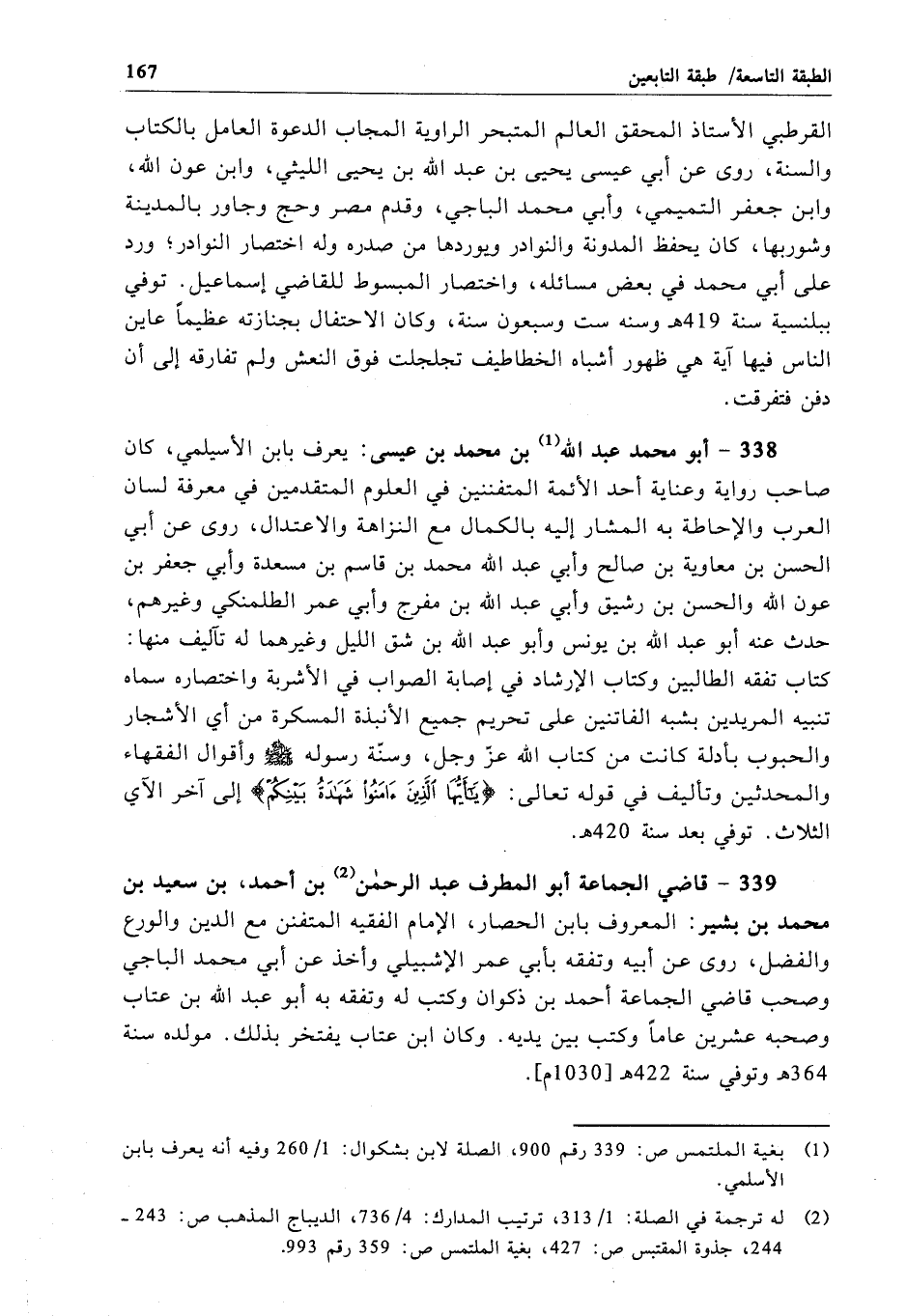 338 - أبو محمد عبد الله بن محمد بن عيسى: يعرف بابن الأسيلمي، كان صاحب رواية وعناية أحد الأئمة المتفننين في العلوم المتقدمين في معرفة لسان العرب والإحاطة به المشار إليه بالكمال مع النزاهة والاعتدال، روى عن أبي الحسن بن معاوية بن صالح وأبي عبد الله محمد بن قاسم بن مسعدة وأبي جعفر بن عون الله والحسن بن رشيق وأبي عبد الله بن مفرج وأبي عمر الطلمنكي وغيرهم، حدث عنه أبو عبد الله بن يونس وأبو عبد الله بن شق الليل وغيرهما له تآليف منها: كتاب تفقه الطالبين وكتاب الإرشاد في إصابة الصواب في الأشربة واختصاره سماه تنبيه المريدين بشبه الفاتنين على تحريم جميع الأنبذة المسكرة من أي الأشجار والحبوب بأدلة كانت من كتاب الله عزّ وجل، وسنّة رسوله - صلى الله عليه وسلم - وأقوال الفقهاء والمحدثين وتأليف في قوله تعالى: {يَا أَيُّهَا الَّذِينَ آمَنُوا شَهَادَةُ بَيْنِكُمْ} إلى آخر الآي الثلاث. توفي بعد سنة 420 هـ.