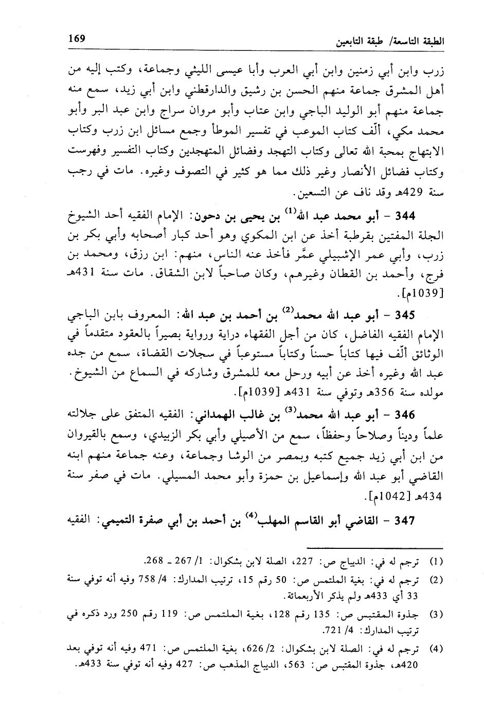 346 - أبو عبد الله محمد بن غالب الهمداني: الفقيه المتفق على جلالته علماً وديناً وصلاحاً وحفظاً، سمع من الأصيلي وأبي بكر الزبيدي، وسمع بالقيروان من ابن أبي زيد جميع كتبه وبمصر من الوشا وجماعة، وعنه جماعة منهم ابنه القاضي أبو عبد الله وإسماعيل بن حمزة وأبو محمد المسيلي. مات في صفر سنة 434هـ[1042 م].