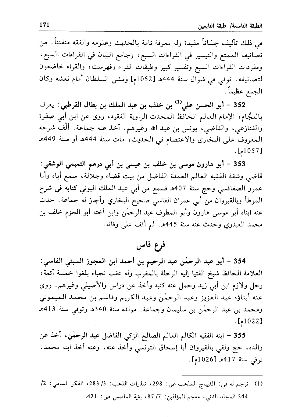 352 - أبو الحسن علي بن خلف بن عبد الملك بن بطال القرطبي: يعرف باللجَّام، الإمام العالم الحافظ المحدث الراوية الفقيه، روى عن ابن أبي صفرة والقنازعي، والقاضي، يونس بن عبد الله وغيرهم. أخذ عنه جماعة. ألّف شرحه المعروف على البخاري والاعتصام في الحديث، مات سنة 444 هـ أو سنة 449 هـ[1057 م].