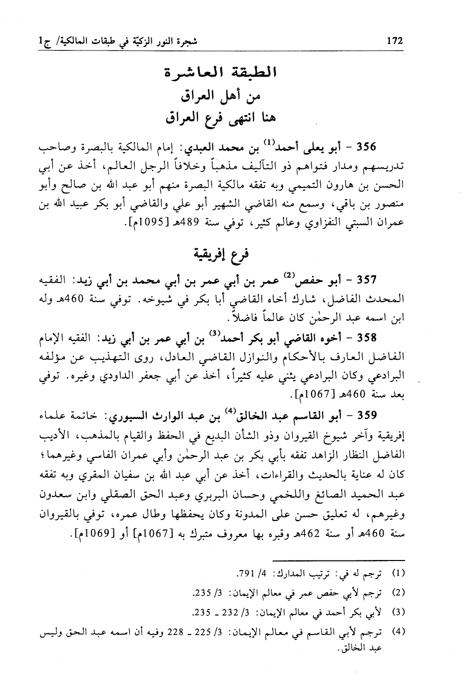 356 - أبو يعلى أحمد بن محمد العبدي: إمام المالكية بالبصرة وصاحب تدريسهم ومدار فتواهم ذو التآليف مذهباً وخلافاً الرجل العالم، أخذ عن أبي الحسن بن هارون التميمي وبه تفقه مالكية البصرة منهم أبو عبد الله بن صالح وأبو منصور بن باقي، وسمع منه القاضي الشهير أبو علي والقاضي أبو بكر عبيد الله بن عمران السبتي النفزاوي وعالم كثير، توفي سنة 489 هـ[1095 م].