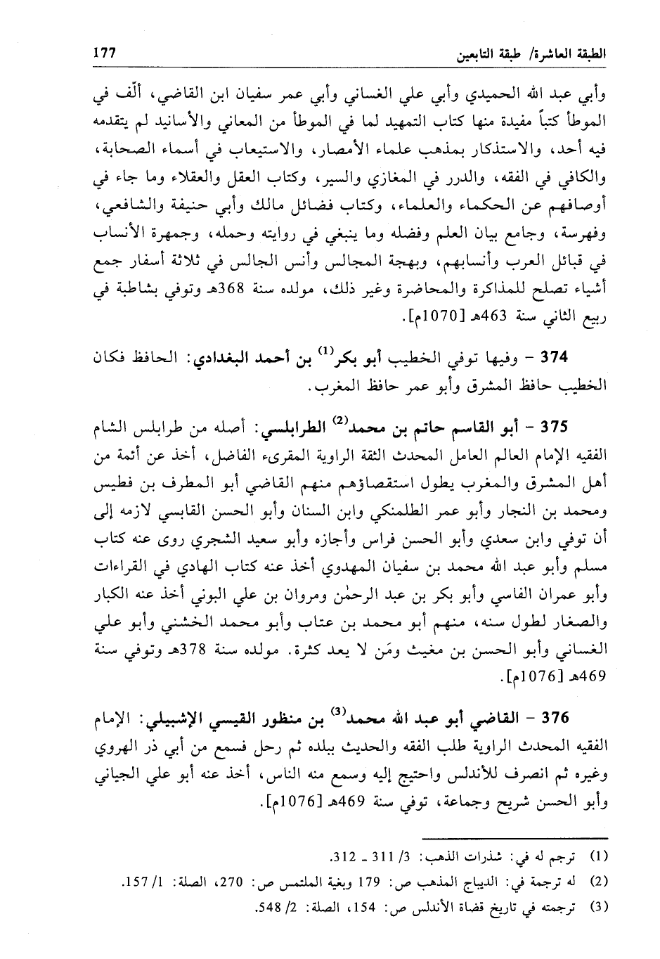 375 - أبو القاسم حاتم بن محمد الطرابلسي: أصله من طرابلس الشام الفقيه الإمام العالم العامل المحدث الثقة الراوية المقرئ الفاضل، أخذ عن أئمة من أهل المشرق والمغرب يطول استقصاؤهم منهم القاضي أبو المطرف بن فطيس ومحمد بن النجار وأبو عمر الطلمنكي وابن السنان وأبو الحسن القابسي لازمه إلى أن توفي وابن سعدي وأبو الحسن فراس وأجازه وأبو سعيد الشجري روى عنه كتاب مسلم وأبو عبد الله محمد بن سفيان المهدوي أخذ عنه كتاب الهادي في القراءات وأبو عمران الفاسي وأبو بكر بن عبد الرحمن ومروان بن علي البوني أخذ عنه الكبار والصغار لطول سنه، منهم أبو محمد بن عتاب وأبو محمد الخشني وأبو علي الغساني وأبو الحسن بن مغيث ومَن لا يعد كثرة. مولده سنة 378 هـ وتوفي سنة 469 هـ[1076 م].