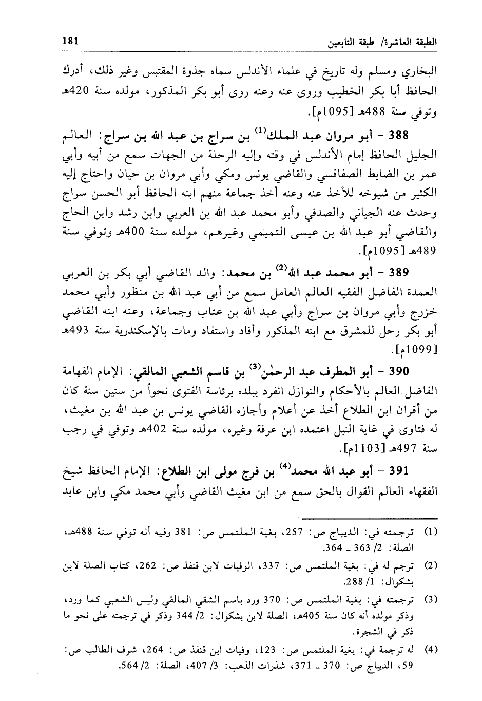388 - أبو مروان عبد الملك بن سراج بن عبد الله بن سراج: العالم الجليل الحافظ إمام الأندلس في وقته وإليه الرحلة من الجهات سمع من أبيه وأبي عمر بن الضابط الصفاقسي والقاضي يونس ومكي وأبي مروان بن حيان واحتاج إليه الكثير من شيوخه للأخذ عنه وعنه أخذ جماعة منهم ابنه الحافظ أبو الحسن سراج وحدث عنه الجياني والصدفي وأبو محمد عبد الله بن العربي وابن رشد وابن الحاج والقاضي أبو عبد الله بن عيسى التميمي وغيرهم، مولده سنة 400 هـ وتوفي سنة 489هـ[1095م].