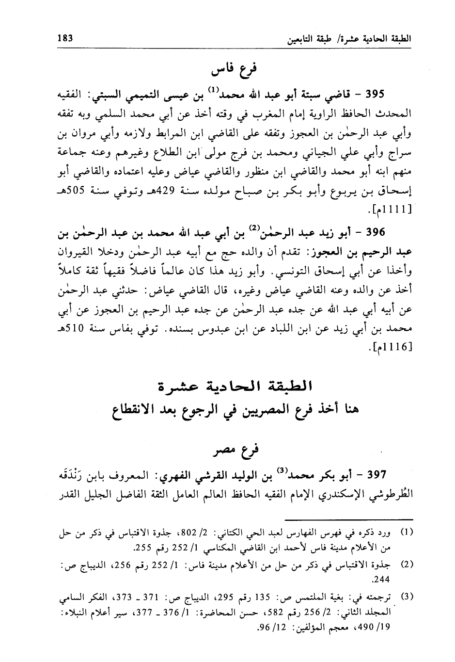 396 - أبو زيد عبد الرحمن بن أبي عبد الله محمد بن عبد الرحمن بن عبد الرحيم بن العجوز: تقدم أن والده حج مع أبيه عبد الرحمن ودخلا القيروان وأخذا عن أبي إسحاق التونسي. وأبو زيد هذا كان عالماً فاضلاً فقيهاً ثقة كاملاً أخذ عن والده وعنه القاضي عياض وغيره، قال القاضي عياض: حدثني عبد الرحمن عن أبيه أبي عبد الله عن جده عبد الرحمن عن جده عبد الرحيم بن العجوز عن أبي محمد بن أبي زيد عن ابن اللباد عن ابن عبدوس بسنده. توفي بفاس سنة 510 هـ[1116 م].