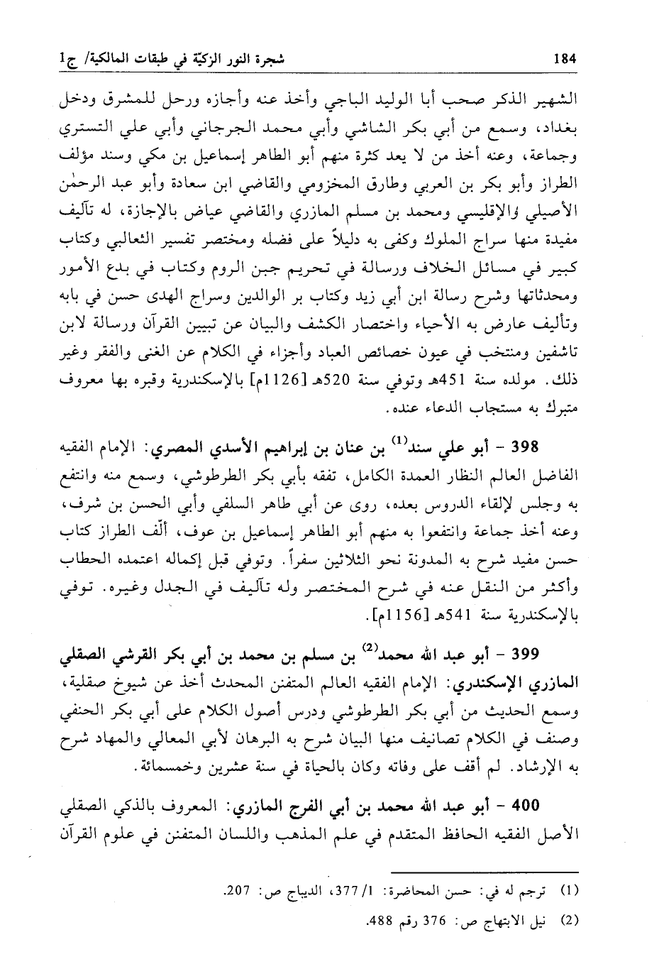 399 - أبو عبد الله محمد بن مسلم بن محمد بن أبي بكر القرشي الصقلي المازري الإسكندري: الإمام الفقيه العالم المتفنن المحدث أخذ عن شيوخ صقلية، وسمع الحديث من أبي بكر الطرطوشي ودرس أصول الكلام على أبي بكر الحنفي وصنف في الكلام تصانيف منها البيان شرح به البرهان لأبي المعالي والمهاد شرح به الإرشاد. لم أقف على وفاته وكان بالحياة في سنة عشرين وخمسمائة.