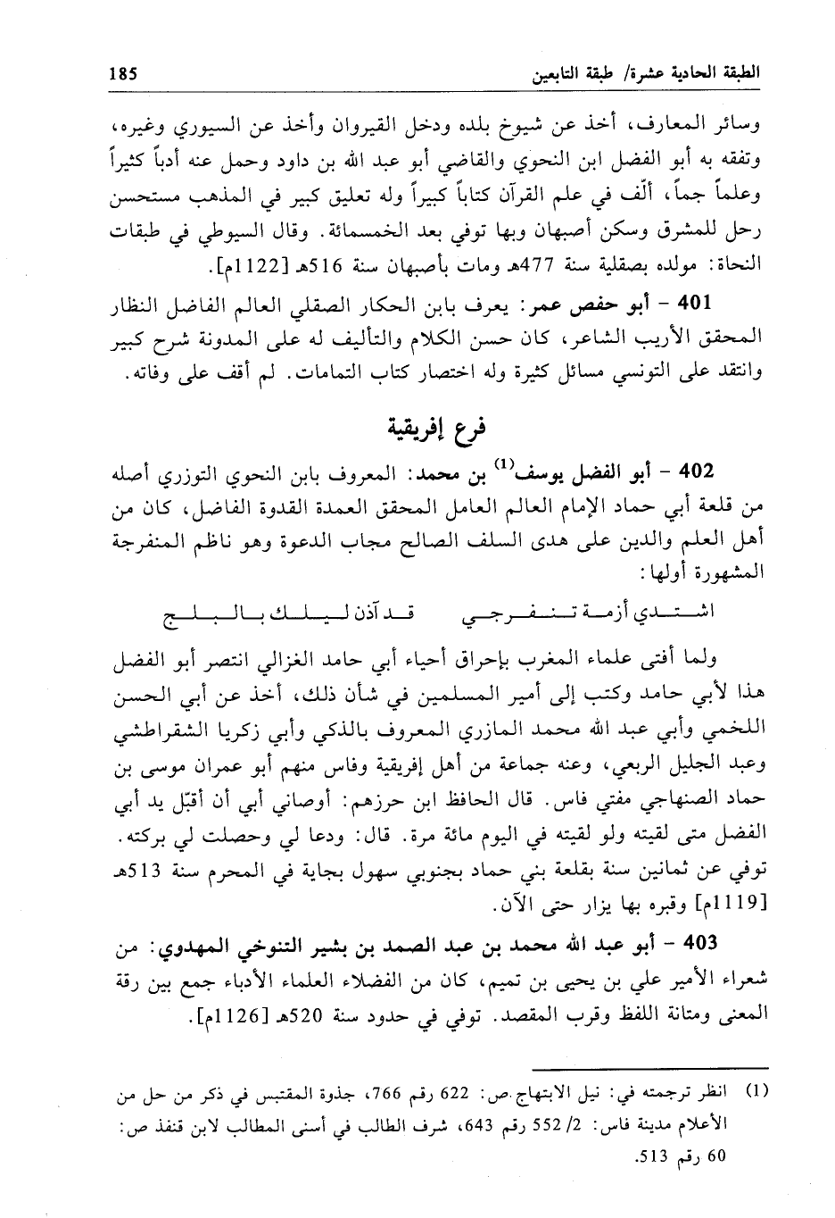 402 - أبو الفضل يوسف بن محمَّد: المعروف بابن النحوي التوزري أصله من قلعة أبي حماد الإِمام العالم العامل المحقق العمدة القدوة الفاضل، كان من أهل العلم والدين على هدى السلف الصالح مجاب الدعوة وهو ناظم المنفرجة المشهورة أولها: