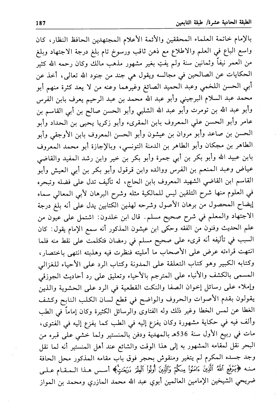بالإمام خاتمة العلماء المحققين والأئمة الأعلام المجتهدين الحافظ النظار، كان واسع الباع في العلم والاطلاع مع ذهن ثاقب ورسوخ تام بلغ درجة الاجتهاد وبلغ من العمر نيفاً وثمانين سنة ولم يفتِ بغير مشهور مذهب مالك وكان رحمه الله كثير الحكايات عن الصالحين في مجالسه ويقول هي جند من جنود الله تعالى، أخذ عن أبي الحسن اللخمي وعبد الحميد الصائغ وغيرهما وعنه من لا يعد كثرة منهم أبو محمد عبد السلام البرجيني وأبو عبد الله محمد بن عبد الرحيم يعرف بابن الفرس وأبو عبد الله بن تومرت وأبو عبد الله الشلبي وأبو الحسن صالح بن أبي القاسم بن عامر وأبو الحسن علي المعروف بابن المقرئ وأبو زكريا يحيى بن الحداد وأبو الحسن بن صاعد وأبو مروان بن عيشون وأبو الحسن المعروف بابن الأوجقي وأبو الطاهر بن مجكان وأبو الطاهر بن الدمنة التونسي، وبالإجازة أبو محمد المعروف بابن عبيد الله وأبو بكر بن أبي جمرة وأبو بكر بن خير وابن رشد المفيد والقاضي عياض وعبد المنعم بن الفرس ووالده وابن قرقول وأبو بكر بن أبي العيش وأبو القاسم ابن القاضي الشهيد المعروف بابن الحاج، له تآليف تدل على فضله وتبحره في العلوم منها شرح التلقين ليس للمالكية مثله وشرح البرهان لأبي المعالي سماه إيضاح المحصول من برهان الأصول وشرحه لهذين الكتابين يدل على أنه بلغ درجة الاجتهاد والمعلم في شرح صحيح مسلم. قال ابن خلدون: اشتمل على عيون من علم الحديث وفنون من الفقه وحكى ابن عيشون المذكور أنه سمع الإِمام يقول: كان السبب في تأليفه أنه قرئ على صحيح مسلم في رمضان فتكلمت على نقط منه فلما انتهت قراءته عرض على الأصحاب ما أمليته فنظرت فيه وهذبته انتهى باختصار، وكتابه الكبير وهو كتاب التعلقة على المدونة وكتاب الرد على الأحياء للغزالي المسمى بالكشف والأنباء على المترجم بالأحياء وتعليق على رد أحاديث الجوزقي وإملاء على رسائل إخوان الصفا والنكت القطعية في الرد على الحشوية والذين يقولون بقدم الأصوات والحروف والواضح في قطع لسان الكلب النابح وكشف الغطا عن لمس الخطا وغير ذلك وله الفتاوى والرسائل الكثيرة وكان إماماً في الطب وألف فيه في حكايته مشهورة وكان يفزع إليه في الطب كما يفزع إليه في الفتوى، مات في ربيع الأول سنة 536 هـ بالمهدية ودفن بالمنستير ولما خشي على قبره من البحر نقل لمقامه المشهور به إلى هذا الوقت والشائع عند أهل المنستير أنه لما نقل وجد جسده المكرم لم يتغير ومنقوش بحجر فوق باب مقامه المذكور محل الحافة منه {يَرْفَعِ اللَّهُ الَّذِينَ آمَنُوا مِنْكُمْ وَالَّذِينَ أُوتُوا الْعِلْمَ دَرَجَاتٍ} أسس هذا المقام على ضريحي الشيخين الإمامين العالمين أبوي عبد الله محمد المازري ومحمد بن المواز