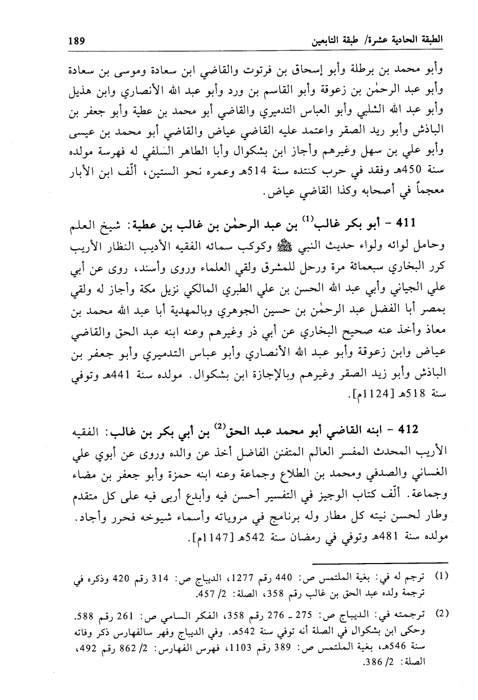 411 - أبو بكر غالب بن عبد الرحمن بن غالب بن عطية: شيخ العلم وحامل لوائه ولواء حديث النبي - صلى الله عليه وسلم - وكوكب سمائه الفقيه الأديب النظار الأريب كرر البخاري سبعمائة مرة ورحل للمشرق ولقي العلماء وروى وأسند، روى عن أبي علي الجياني وأبي عبد الله الحسن بن علي الطبري المالكي نزيل مكة وأجاز له ولقي بمصر أبا الفضل عبد الرحمن بن حسين الجوهري وبالمهدية أبا عبد الله محمد بن معاذ وأخذ عنه صحيح البخاري عن أبي ذر وغيرهم وعنه ابنه عبد الحق والقاضي عياض وابن زعوقة وأبو عبد الله الأنصاري وأبو عباس التدميري وأبو جعفر بن الباذش وأبو زيد الصقر وغيرهم وبالإجازة ابن بشكوال. مولده سنة 441 هـ وتوفي سنة 518 هـ[1124 م].