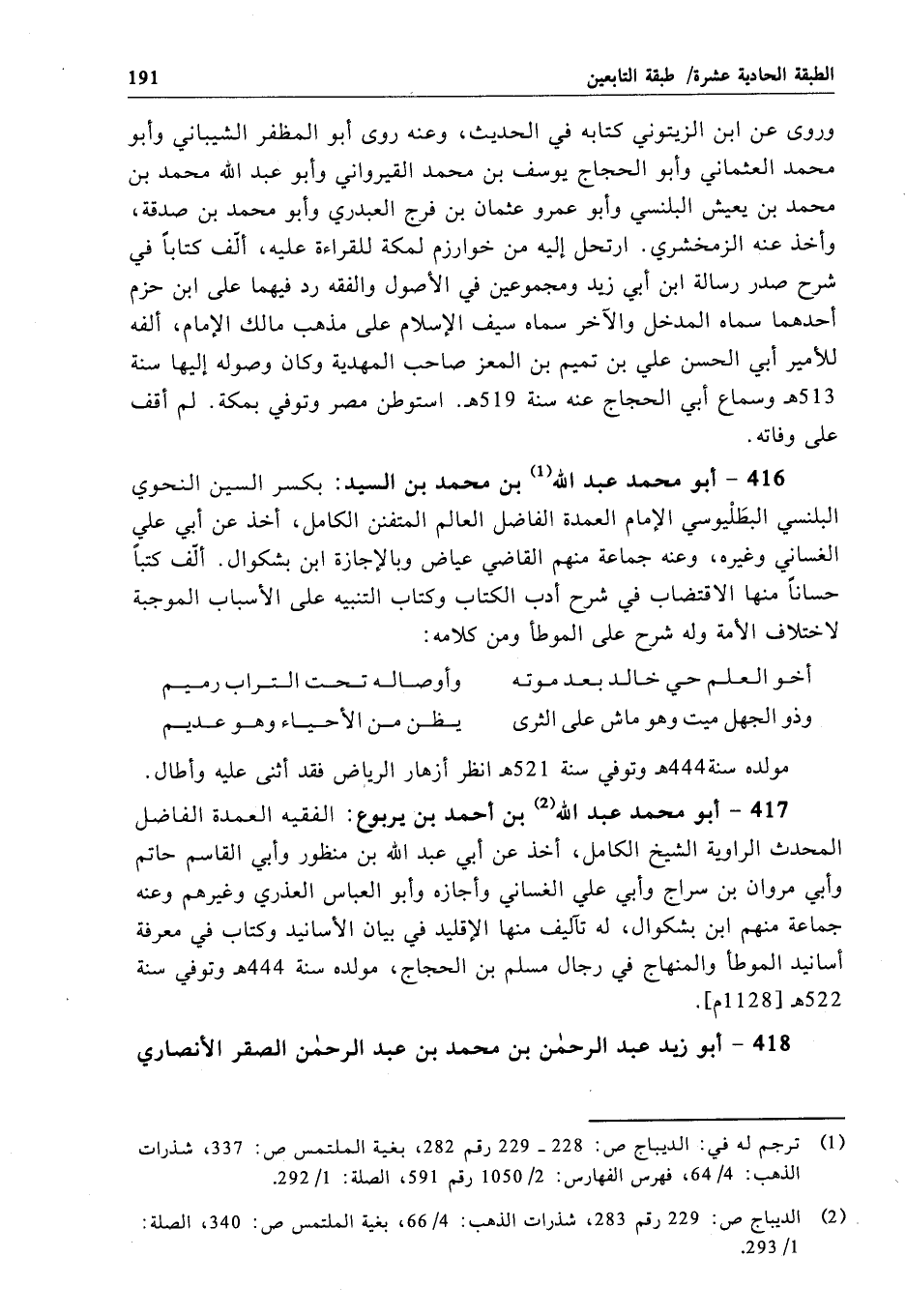 416 - أبو محمد عبد الله بن محمد بن السيد: بكسر السين النحوي البلنسي البطَلْيوسي الإِمام العمدة الفاضل العالم المتفنن الكامل، أخذ عن أبي علي الغساني وغيره، وعنه جماعة منهم القاضي عياض وبالإجازة ابن بشكوال. ألّف كتباً حساناً منها الاقتضاب في شرح أدب الكتاب وكتاب التنبيه على الأسباب الموجبة لاختلاف الأمة وله شرح على الموطأ ومن كلامه: