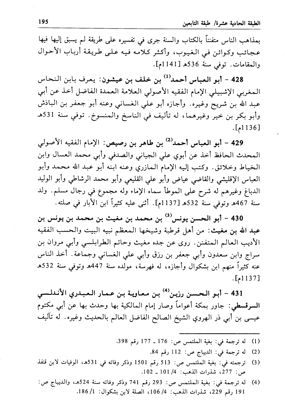 429 - أبو العباس أحمد بن طاهر بن رصيص: الإِمام الفقيه الأصولي المحدث الحافظ أخذ عن أبوي علي الجياني والصدفي وأبي محمد العسال وابن الخياط وخلائق. وكتب إليه الإِمام المازري وعنه ابنه أبو عبد الله محمد وأبو العباس الإقليشي والقاضي عياض وأبو علي القليعي وأبو محمد الرشاطي وأبو الوليد الدباغ وغيرهم له شرح على الموطأ سماه الإماء وله مجموع في رجال مسلم. ولد سنة 467 هـ وتوفي سنة 532 هـ[1137 م]. أثنى عليه كثيراً ابن الأبار في صلته.