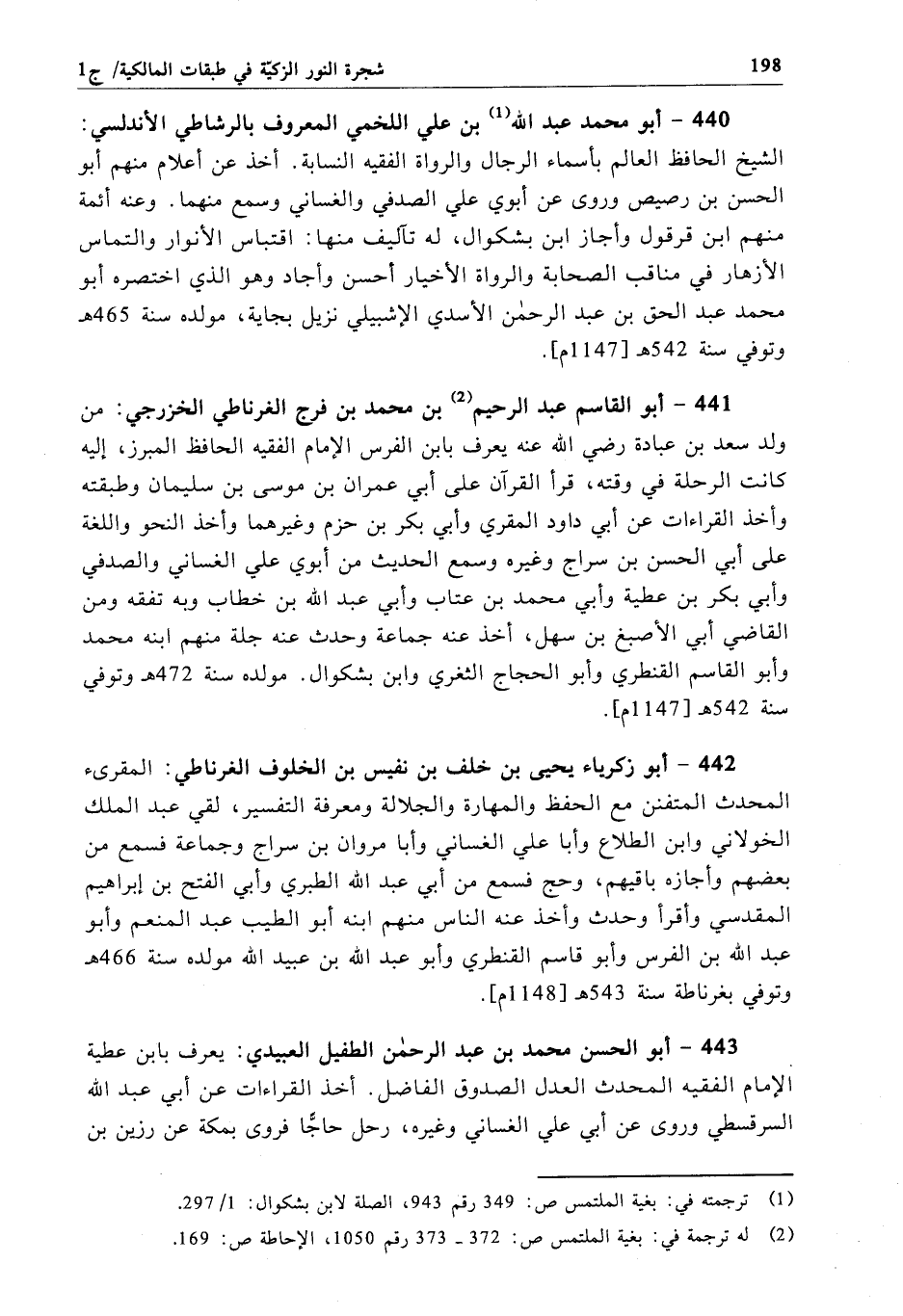 442 - أبو زكرياء يحيى بن خلف بن نفيس بن الخلوت الغرناطي: المقرئ المحدث المتفنن مع الحفظ والمهارة والجلالة ومعرفة التفسير، لقي عبد الملك الخولاني وابن الطلاع وأبا علي الغساني وأبا مروان بن سراج وجماعة فسمع من بعضهم وأجازه باقيهم، وحج فسمع من أبي عبد الله الطبري وأبي الفتح بن إبراهيم المقدسي وأقرأ وحدث وأخذ عنه الناس منهم ابنه أبو الطيب عبد المنعم وأبو عبد الله بن الفرس وأبو قاسم القنطري وأبو عبد الله بن عبيد الله مولده سنة 466 هـ وتوفي بغرناطة سنة 543 هـ[1148م].