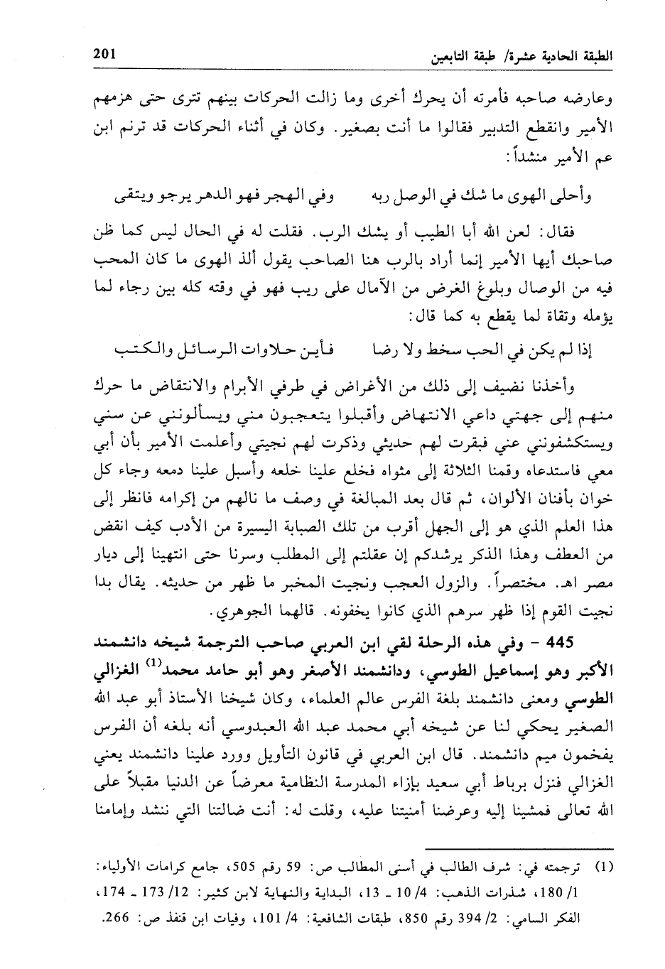 445 - وفي هذه الرحلة لقي ابن العربي صاحب الترجمة شيخه دانشمند الأكبر وهو إسماعيل الطوسي، ودانشمند الأصغر وهو أبو حامد محمد الغزالي الطوسي ومعنى دانشمند بلغة الفرس عالم العلماء، وكان شيخنا الأستاذ أبو عبد الله الصغير يحكي لنا عن شيخه أبي محمد عبد الله العبدوسي أنه بلغه أن الفرس يفخمون ميم دانشمند. قال ابن العربي في قانون التأويل وورد علينا دانشمند يعني الغزالي فنزل برباط أبي سعيد بإزاء المدرسة النظامية معرضاً عن الدنيا مقبلاً على الله تعالى فمشينا إليه وعرضنا أمنيتنا عليه، وقلت له: أنت ضالتنا التي ننشد وإمامنا