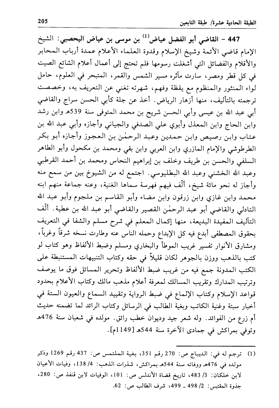 447 - القاضي أبو الفضل عياض بن موسى بن عياض اليحصبي: الشيخ الإِمام قاضي الأئمة وشيخ الإِسلام وقدوة العلماء الأعلام عمدة أرباب المحابر والأقلام والفضائل التي أشغلت رسومها فلم تحتج إلى أعمال أعلام الشائع الصيت في كل قطر ومصر، سارت مآثره مسير الشمس والقمر، المتبحر في العلوم، حامل لواء المنثور والمنظوم مع يقظة وفهم، شهرته تغني عن التعريف به، وخصصت ترجمته بالتأليف، منها أزهار الرياض. أخذ عن جلة كأبي الحسن سراج والقاضي أبي عبد الله بن عيسى وأبي الحسن شريح بن محمد المتوفى سنة 539 هـ وابن رشد وابن الحاج وابن المعذل وأبوي علي الصدفي والجياني وأجازه وأبي عبد الله بن عتاب وابن رصيص وابن حمدين وعبد الرحمن بن العجوز وأجازه أبو بكر الطرطوشي والإمام المازري وابن العربي وابن بقي ومحمد بن مكحول وأبو الطاهر السلفي والحسن بن طريف وخلف بن إبراهيم النحاس ومحمد بن أحمد القرطبي وعبد الله الخشني وعبد الله البطليوسي. اجتمع له من الشيوخ بين من سمع منه وأجاز له نحو مائة شيخ، ألّف فيهم فهرسة سماها الغنية، وعنه جماعة منهم ابنه محمد وابن غازي وابن زرقون وابن مضاء وأبو القاسم بن ملجوم وأبو عبد الله التادلي والقاضي أبو عبد الرحمن القصير والقاضي أبو عبد الله بن عطية. ألّف التآليف المفيدة البديعة، منها إكمال المعلم في شرح مسلم والشفا في التعريف بحقوق المصطفى أبدع فيه كل الإبداع وحمله الناس عنه وطارت نسخه شرقاً وغرباً، ومشارق الأنوار تفسير غريب الموطأ والبخاري ومسلم وضبط الألفاظ وهو كتاب لو كتب بالذهب ووزن بالجوهر لكان قليلاً في حقه وكتاب التنبيهات المستنبطة على الكتب المدونة جمع فيه من غريب ضبط الألفاظ وتحرير المسائل فوق ما يوصف وترتيب المدارك وتقريب المسالك لمعرفة أعلام مذهب مالك وكتاب الأعلام بحدود قواعد الإِسلام وكتاب الإلماع في ضبط الرواية وتقييد السماع والعيون الستة في أخبار سبتة وغنية الكاتب وبغية الطالب في الرسائل وكتاب الرائد لما تضمنه حديث أم زرع من الفوائد. وله شعر جيد وديوان خطب رائق. مولده في شعبان سنة 476 هـ وتوفي بمراكش في جمادى الآخرة سنة 544 هـ[1149 م].