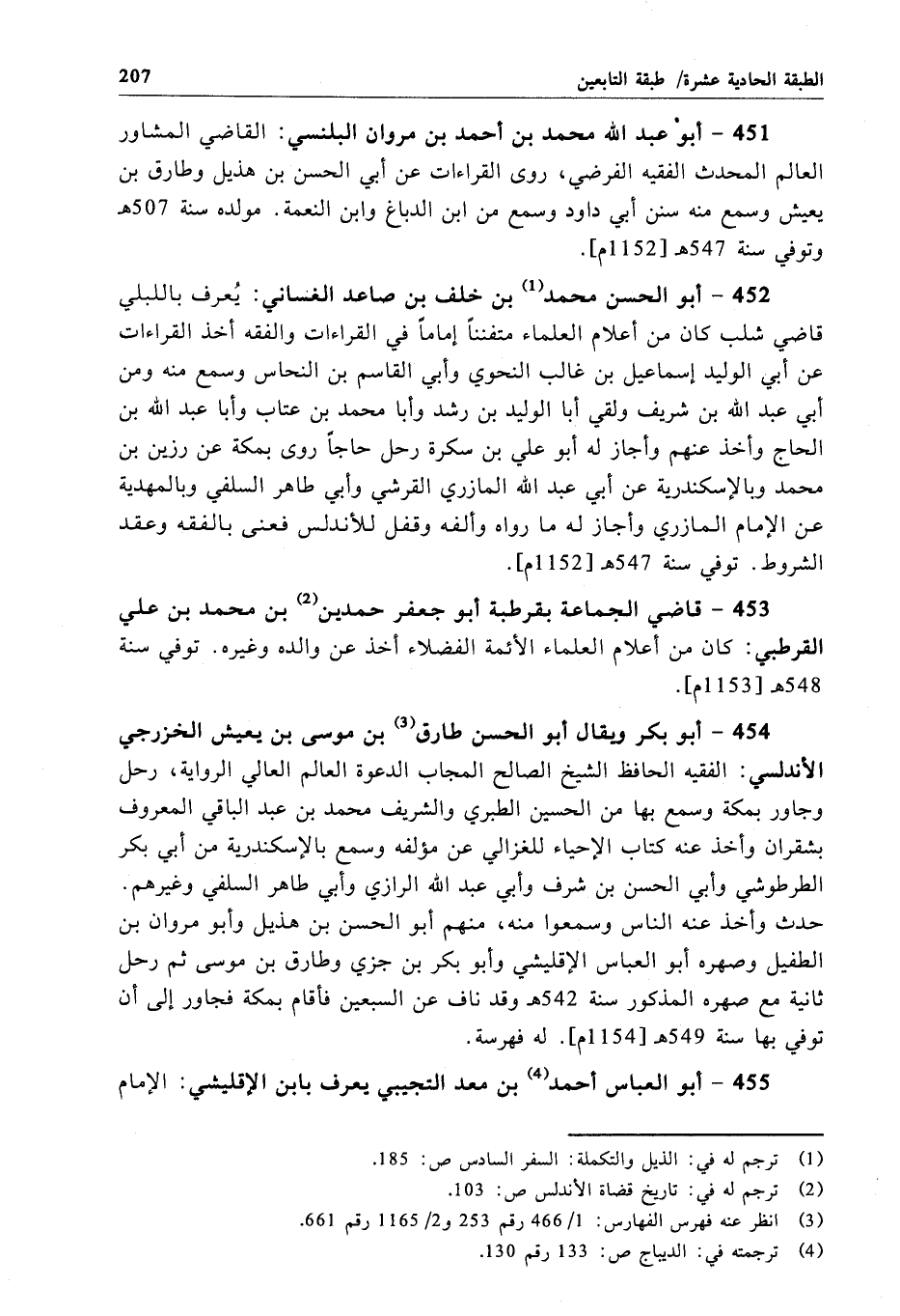 454 - أبو بكر ويقال أبو الحسن طارق بن موسى بن يعيش الخزرجي الأندلسي: الفقيه الحافظ الشيخ الصالح المجاب الدعوة العالم العالي الرواية, رحل وجاور بمكة وسمع بها من الحسين الطبري والشريف محمد بن عبد الباقي المعروف بشقران وأخذ عنه كتاب الإحياء للغزالي عن مؤلفه وسمع بالإسكندرية من أبي بكر الطرطوشي وأبي الحسن بن شرف وأبي عبد الله الرازي وأبي طاهر السلفي وغيرهم. حدث وأخذ عنه الناس وسمعوا منه، منهم أبو الحسن بن هذيل وأبو مروان بن الطفيل وصهره أبو العباس الإقليشي وأبو بكر بن جزي وطارق بن موسى ثم رحل ثانية مع صهره المذكور سنة 542 هـ وقد ناف عن السبعين فأقام بمكة فجاور إلى أن توفي بها سنة 549 هـ[1154 م]. له فهرسة.
