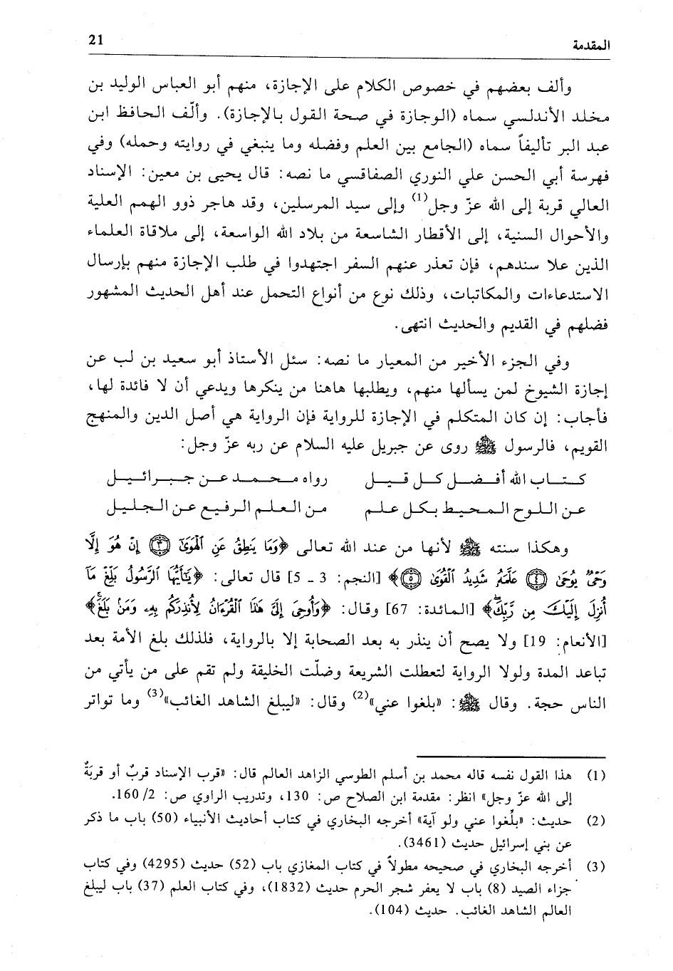 وهكذا سنته - صلى الله عليه وسلم - لأنها من عند الله تعالى {وَمَا يَنْطِقُ عَنِ الْهَوَى (3) إِنْ هُوَ إِلَّا وَحْيٌ يُوحَى (4) عَلَّمَهُ شَدِيدُ الْقُوَى (5)} [النجم: 3 - 5] قال تعالى: {يَا أَيُّهَا الرَّسُولُ بَلِّغْ مَا أُنْزِلَ إِلَيْكَ مِنْ رَبِّكَ} [المائدة: 67]، وقال: {وَأُوحِيَ إِلَيَّ هَذَا الْقُرْآنُ لِأُنْذِرَكُمْ بِهِ وَمَنْ بَلَغَ} [الأنعام: 19] ولا يصح أن ينذر به بعد الصحابة إلا بالرواية، فلذلك بلغ الأمة بعد تباعد المدة ولولا الرواية لتعطلت الشريعة وضلّت الخليقة ولم تقم على من يأتي من الناس حجة. وقال - صلى الله عليه وسلم -: "بلغوا عني" وقال: "ليبلغ الشاهد الغائب" وما تواتر