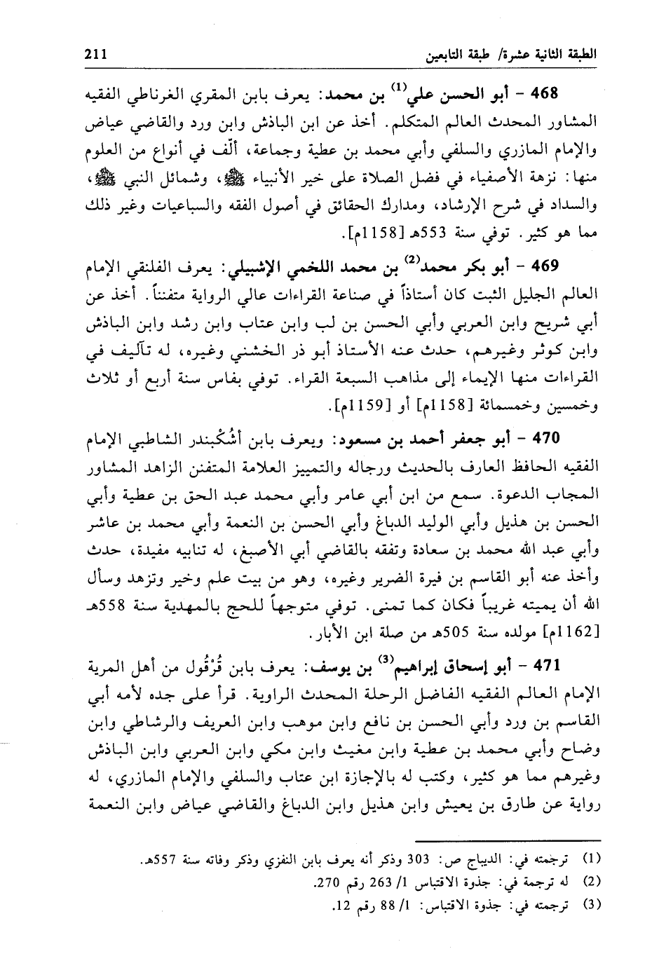 471 - أبو إسحاق إبراهيم بن يوسف: يعرف بابن قُرْقُول من أهل المرية الإِمام العالم الفقيه الفاضل الرحلة المحدث الراوية. قرأ على جده لأمه أبي القاسم بن ورد وأبي الحسن بن نافع وابن موهب وابن العريف والرشاطي وابن وضاح وأبي محمَّد بن عطية وابن مغيث وابن مكي وابن العربي وابن الباذش وغيرهم مما هو كثير، وكتب له بالإجازة ابن عتاب والسلفي والإمام المازري، له رواية عن طارق بن يعيش وابن هذيل وابن الدباغ والقاضي عياض وابن النعمة