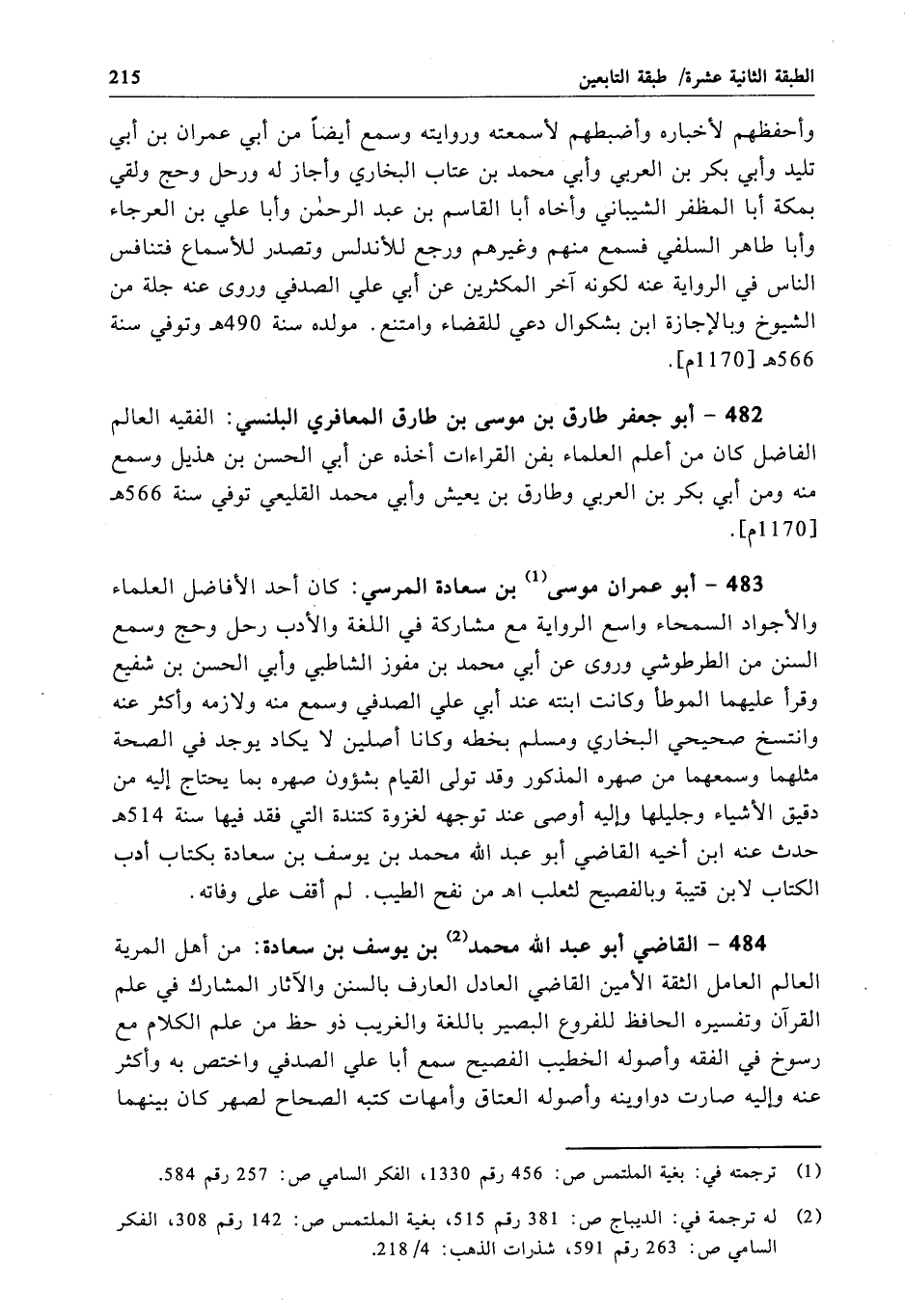 483 - أبو عمران موسى بن سعادة المرسي: كان أحد الأفاضل العلماء والأجواد السمحاء واسع الرواية مع مشاركة في اللغة والأدب رحل وحج وسمع السنن من الطرطوشي وروى عن أبي محمَّد بن مفوز الشاطبي وأبي الحسن بن شفيع وقرأ عليهما الموطأ وكانت ابنته عند أبي علي الصدفي وسمع منه ولازمه وأكثر عنه وانتسخ صحيحي البخاري ومسلم بخطه وكانا أصلين لا يكاد يوجد في الصحة مثلهما وسمعهما من صهره المذكور وقد تولى القيام بشؤون صهره بما يحتاج إليه من دقيق الأشياء وجليلها وإليه أوصى عند توجهه لغزوة كتندة التي فقد فيها سنة 514 هـ حدث عنه ابن أخيه القاضي أبو عبد الله محمَّد بن يوسف بن سعادة بكتاب أدب الكتاب لابن قتيبة وبالفصيح لثعلب اهـ من نفح الطيب. لم أقف على وفاته.