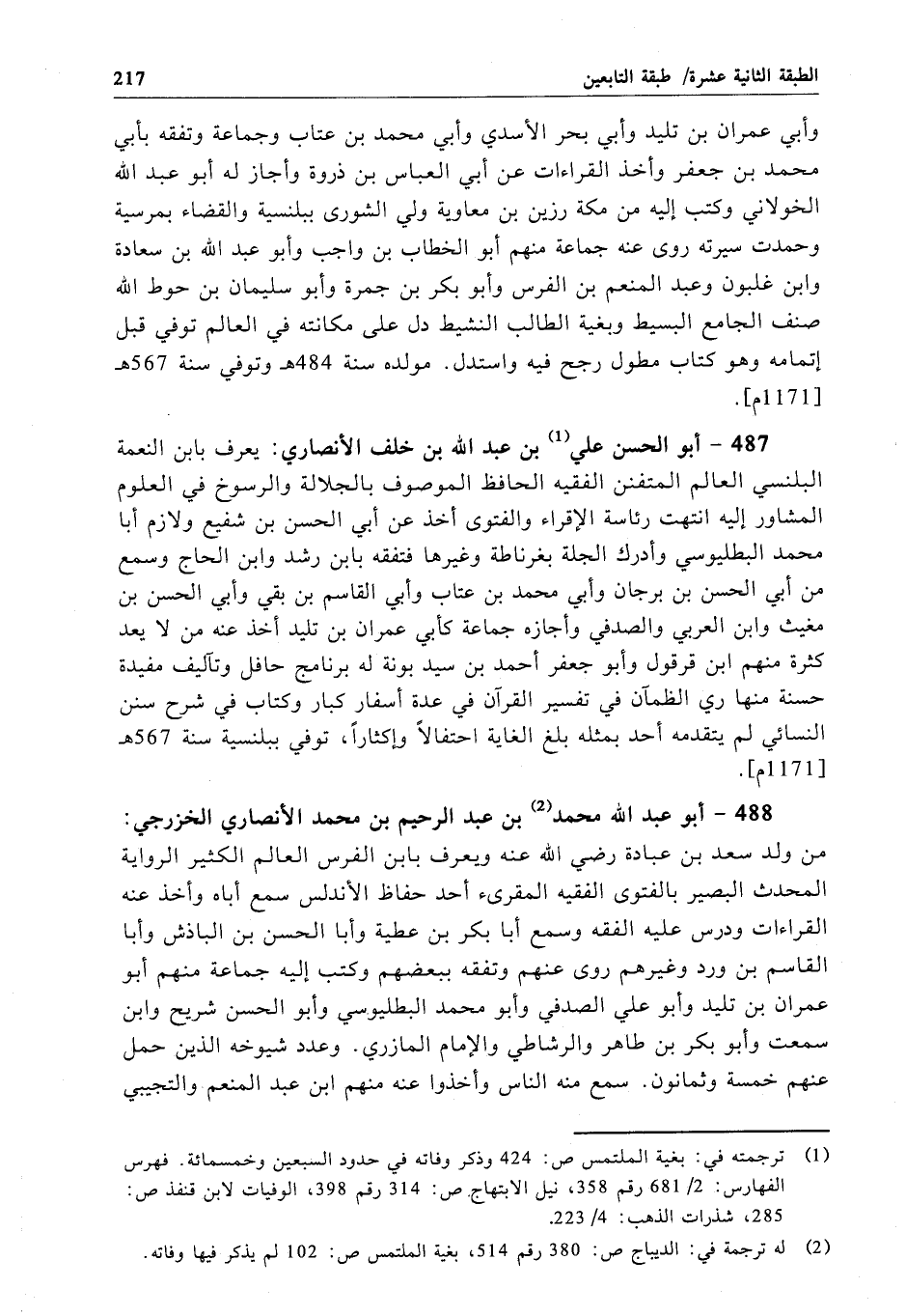 487 - أبو الحسن علي بن عبد الله بن خلف الأنصاري: يعرف بابن النعمة البلنسي العالم المتفنن الفقيه الحافظ الموصوف بالجلالة والرسوخ في العلوم المشاور إليه انتهت رئاسة الإقراء والفتوى أخذ عن أبي الحسن بن شفيع ولازم أبا محمَّد البطليوسي وأدرك الجلة بغرناطة وغيرها فتفقه بابن رشد وابن الحاج وسمع من أبي الحسن بن برجان وأبي محمَّد بن عتاب وأبي القاسم بن بقي وأبي الحسن بن مغيث وابن العربي والصدفي وأجازه جماعة كأبي عمران بن تليد أخذ عنه من لا يعد كثرة منهم ابن قرقول وأبو جعفر أحمد بن سيد بونة له برنامج حافل وتآليف مفيدة حسنة منها ري الظمآن في تفسير القرآن في عدة أسفار كبار وكتاب في شرح سنن النسائي لم يتقدمه أحد بمثله بلغ الغاية احتفالاً وإكثاراً، توفي ببلنسية سنة 567 هـ[1171م].