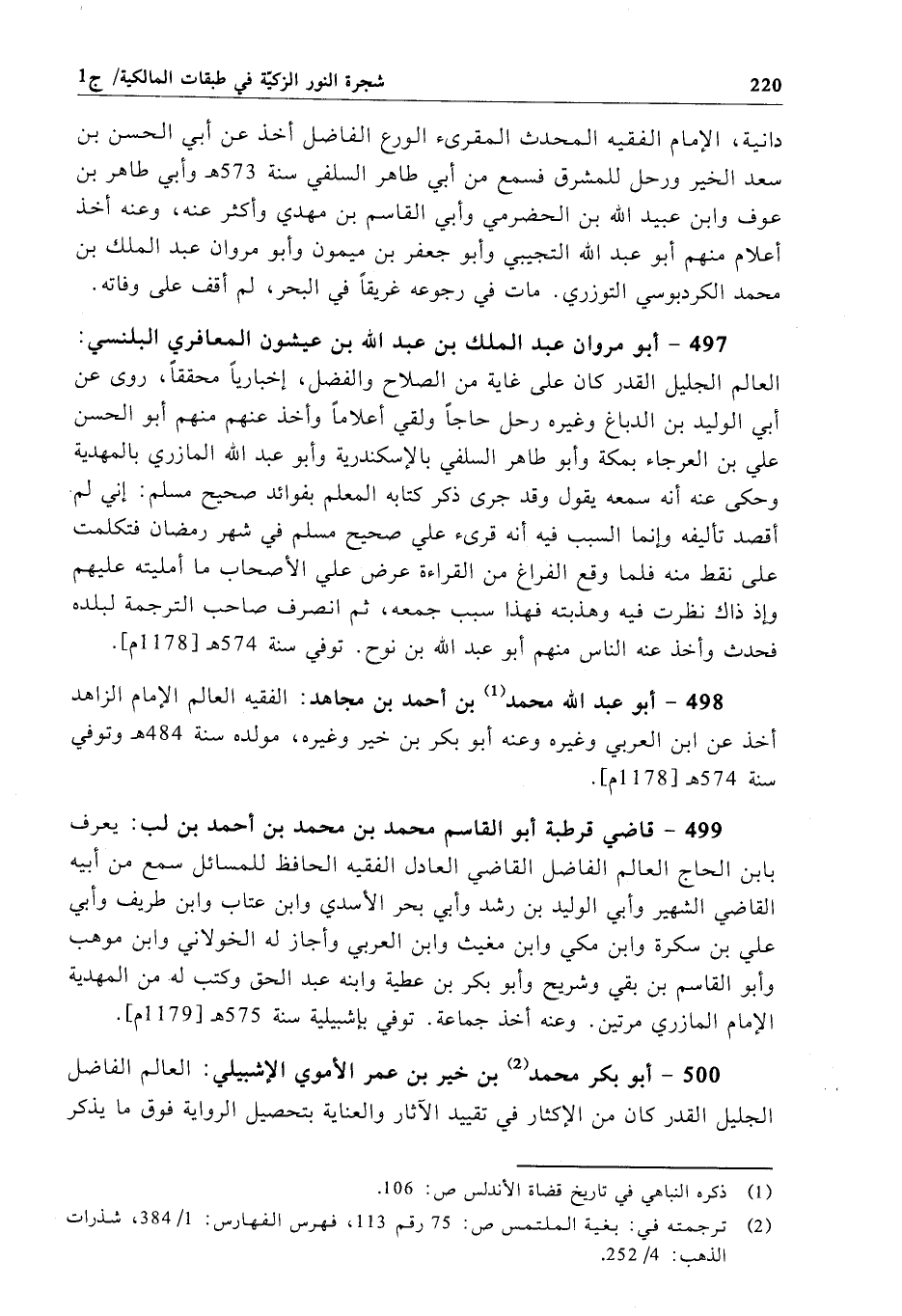500 - أبو بكر محمَّد بن خير بن عمر الأموي الإشبيلي: العالم الفاضل الجليل القدر كان من الإكثار في تقييد الآثار والعناية بتحصيل الرواية فوق ما يذكر