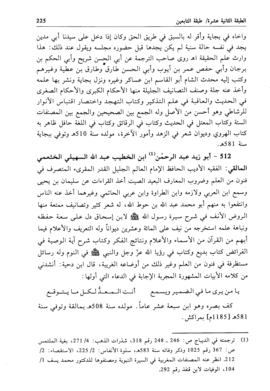 512 - أبو زيد عبد الرحمن ابن الخطيب عبد الله السهيلي الخثعمي المالقي: الفقيه الأديب الحافظ الإِمام العالم الجليل القدر المقرىء المتصرف في فنون من العلم وضروب المعارف البعيد الصيت أخذ القراءات عن سليمان بن يحيى وسمع ابن العربي ولازمه وابن الطراوة وابن عربي الحاتمي وغيرهما أخذ عنه الناس وانتفعوا به منهم أبو محمَّد عبد الله بن حوط الله، له شعر كثير وتصانيف ممتعة منها الروض الأنف في شرح سيرة رسول الله - صلى الله عليه وسلم - لابن إسحاق دل على سعة حفظه ونباهة علمه استخرجه من نيف على المائة وعشرين ديواناً وله التعريف والأعلام فيما أبهم من القرآن من الأسماء والأعلام ونتائج الفكر وكتاب شرح آية الوصية في الفرائض كتاب بديع وكتاب في رؤيا الله عزّ وجل والنبي - صلى الله عليه وسلم - في النوم وله رسائل مستظرفة في فنون من العلم وغير ذلك من أوضاعه الغريبة، قال ابن دحية: أنشدني من كلامه الأبيات المشهورة المجربة الإجابة في الدعاء التي أولها: